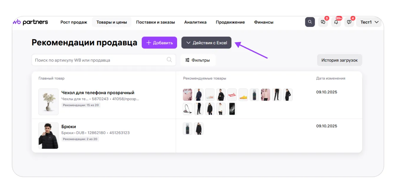 Перейти к массовому добавлению можно через кнопку «Действия с Excel» на странице рекомендаций.