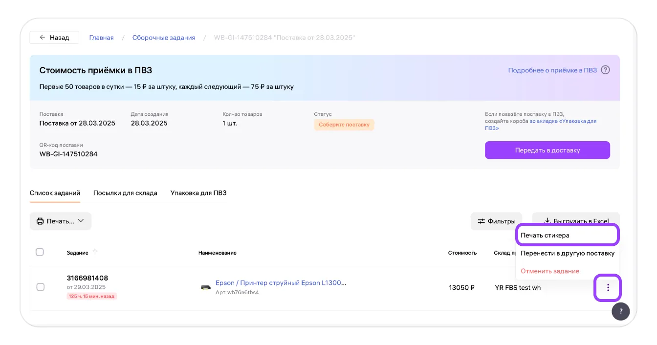 Далее откроется страница с деталями поставки. Выберите на ней нужное задание, нажмите три точки справа и выберите «Печать стикера».