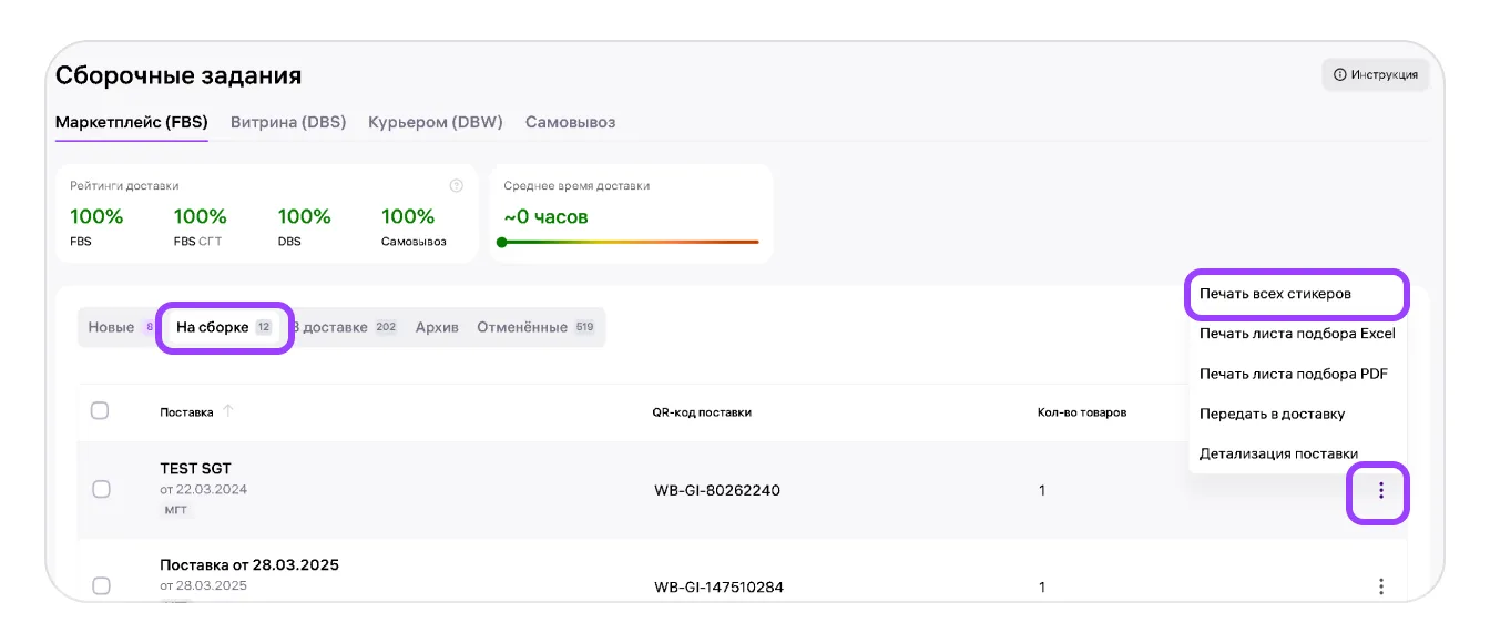На странице сборочных заданий «Маркетплейс (FBS)» откройте вкладку «На сборке» или «В доставке», найдите нужную поставку, нажмите три точки справа и выберите «Печать всех стикеров».