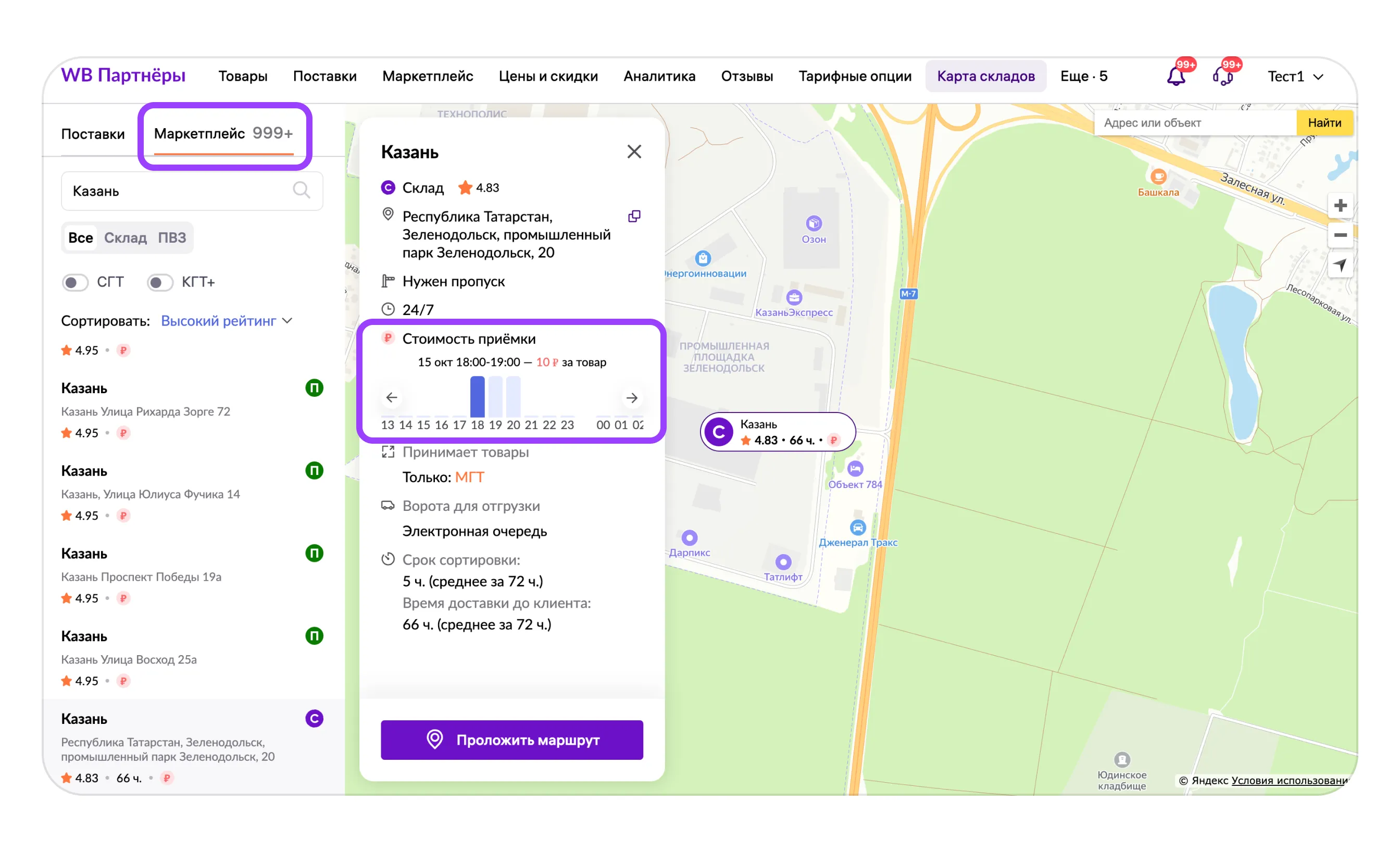 Выберите склад или СЦ, куда повезёте товары на карте складов. Перейдите на вкладку «Маркетплейс», найдите в списке или поиском нужное место и кликните на него — откроется карточка со всей необходимой информацией по складу (СЦ).