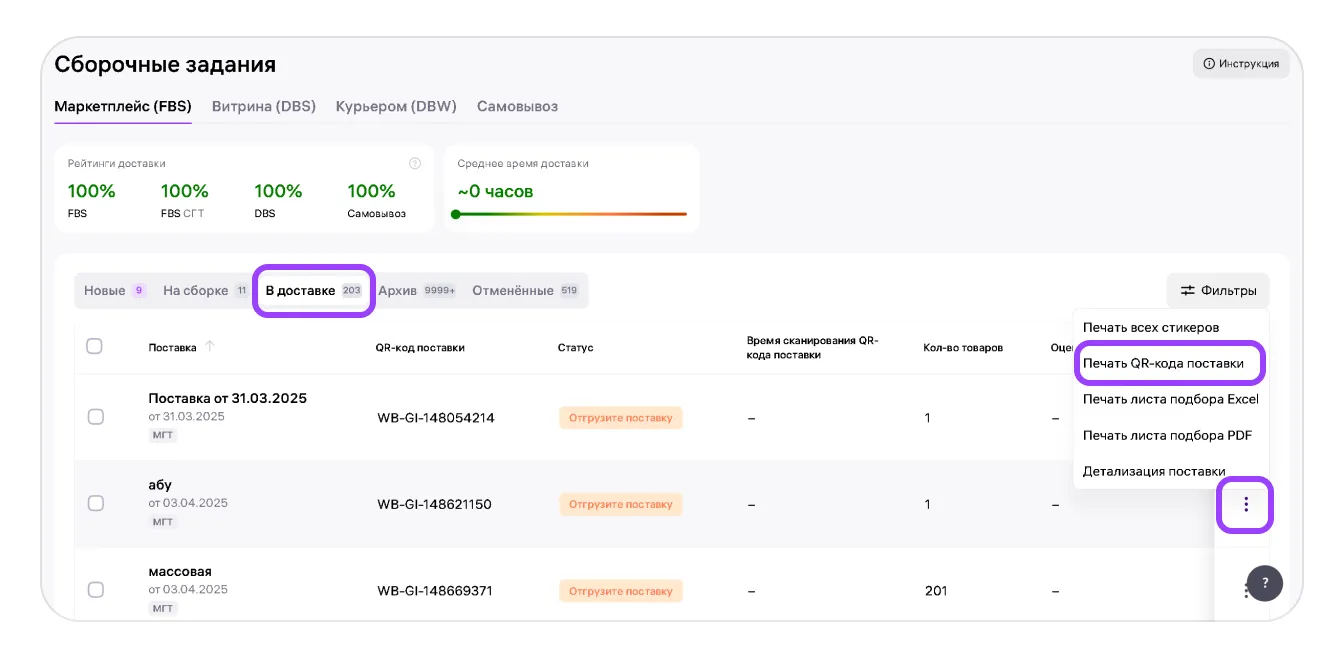 Перейдите на вкладку «В доставке», найдите нужную поставку, нажмите три точки справа и выберите «Печать QR-кода поставки».