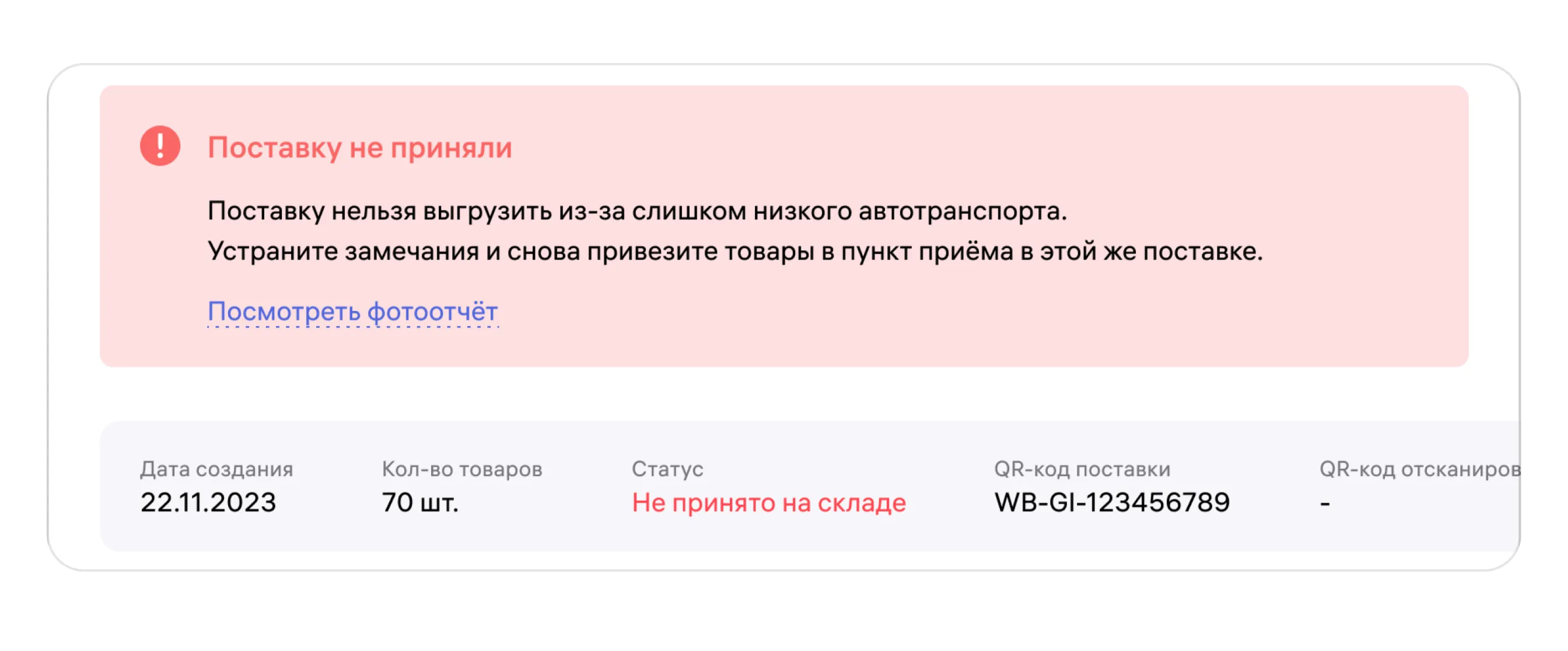 У такой поставки будет статус «Не принято на складе» — нажмите на него, чтобы узнать причину.