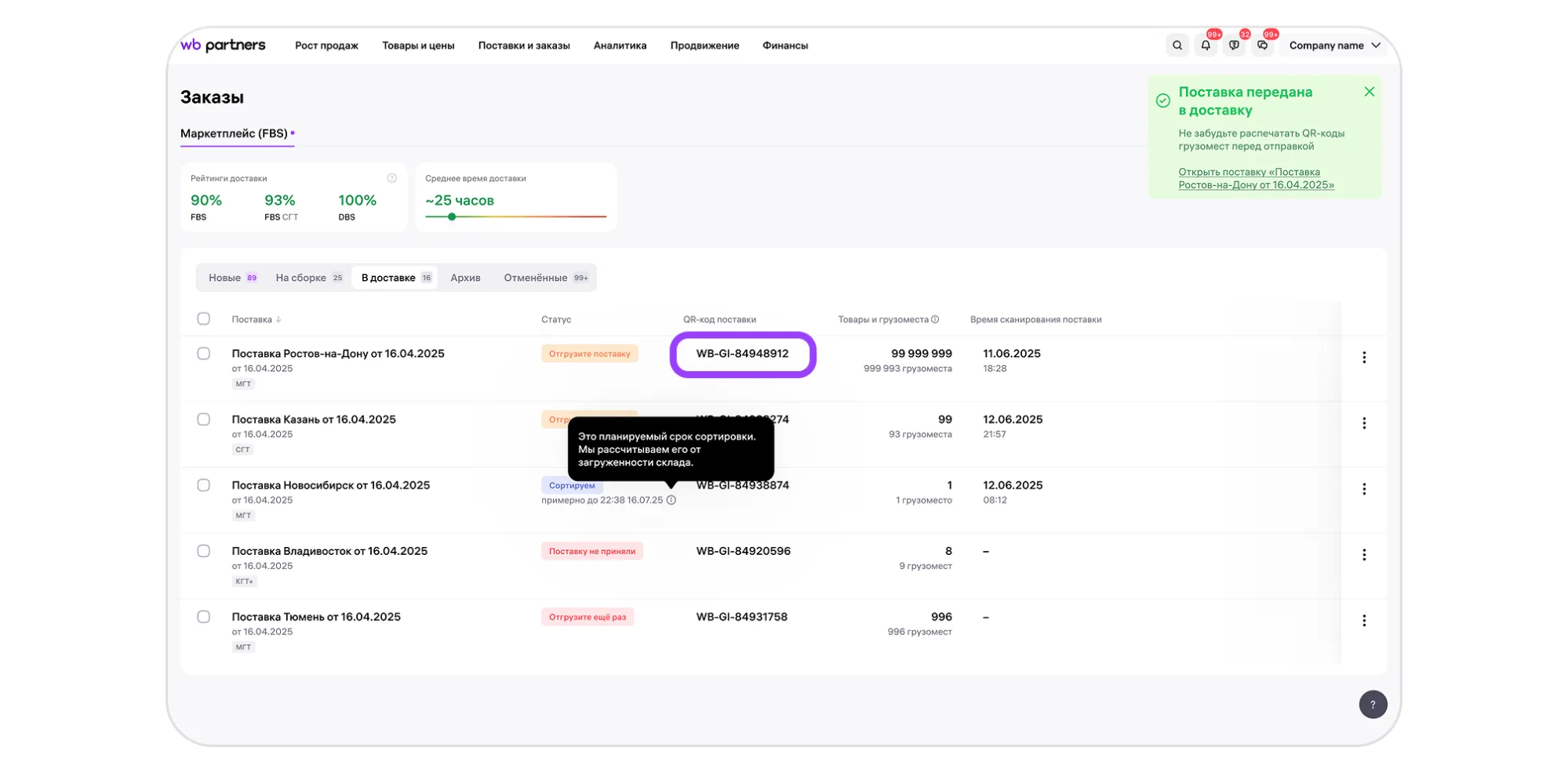 Пока покупатели не получат товары, у поставки будет статус «Поставка в обработке», а у товаров внутри поставки — «Отсортировано». Таймер, который показывает, как давно сделан заказ, остановится.