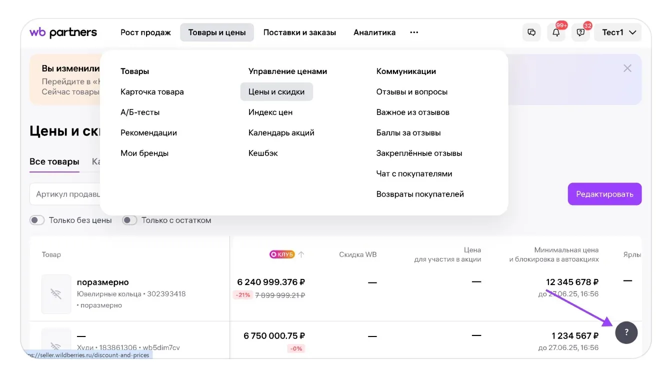 Статья доступна только продавцам Wildberries. Прочитать её можно на портале в разделе Товары и цены → Цены и и скидки. Чтобы открыть окно с инструкциями, нажмите на кружок со знаком вопроса в правом нижнем углу страницы раздела: