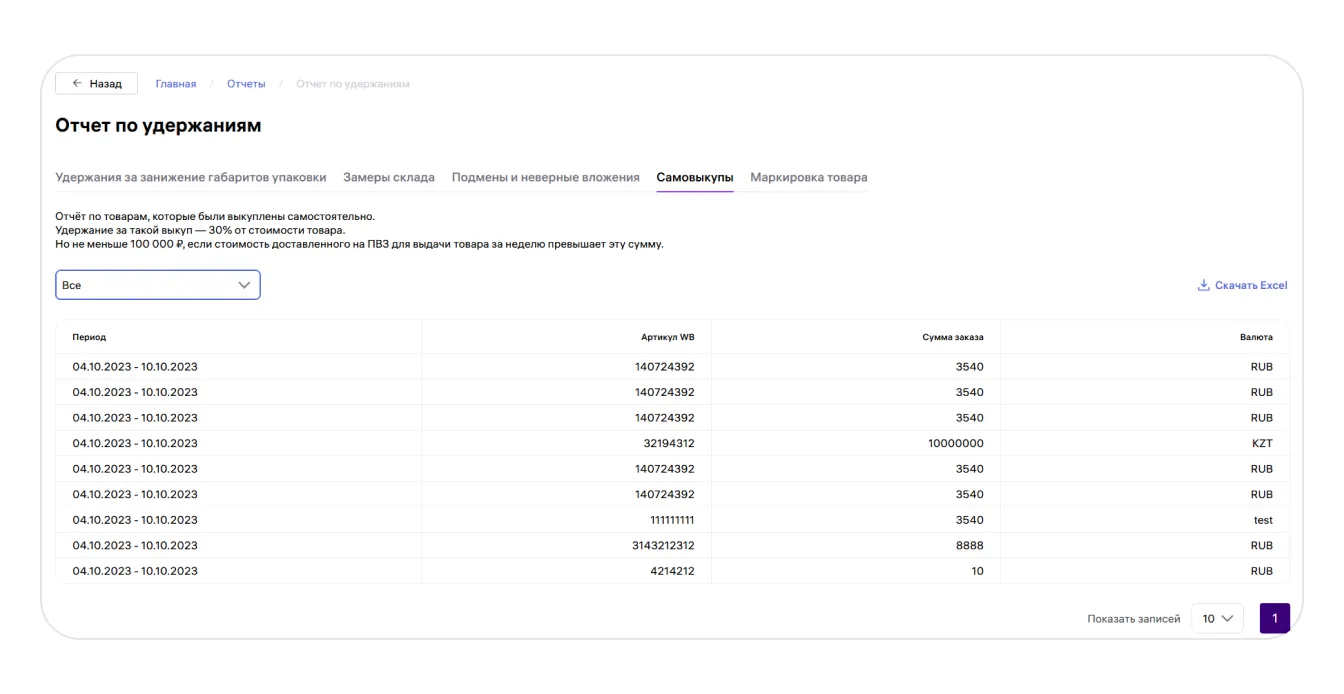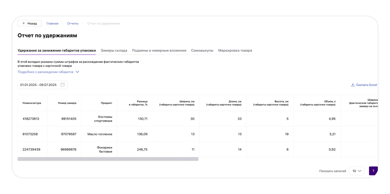 Если по результатам такого замера выявят, что реальные габариты товара в упаковке больше тех, что указаны в карточке, продавцу начислят удержание. На этой вкладке вы можете увидеть подробности и результаты таких замеров, а также суммы удержаний по итогам каждого несоответствия.