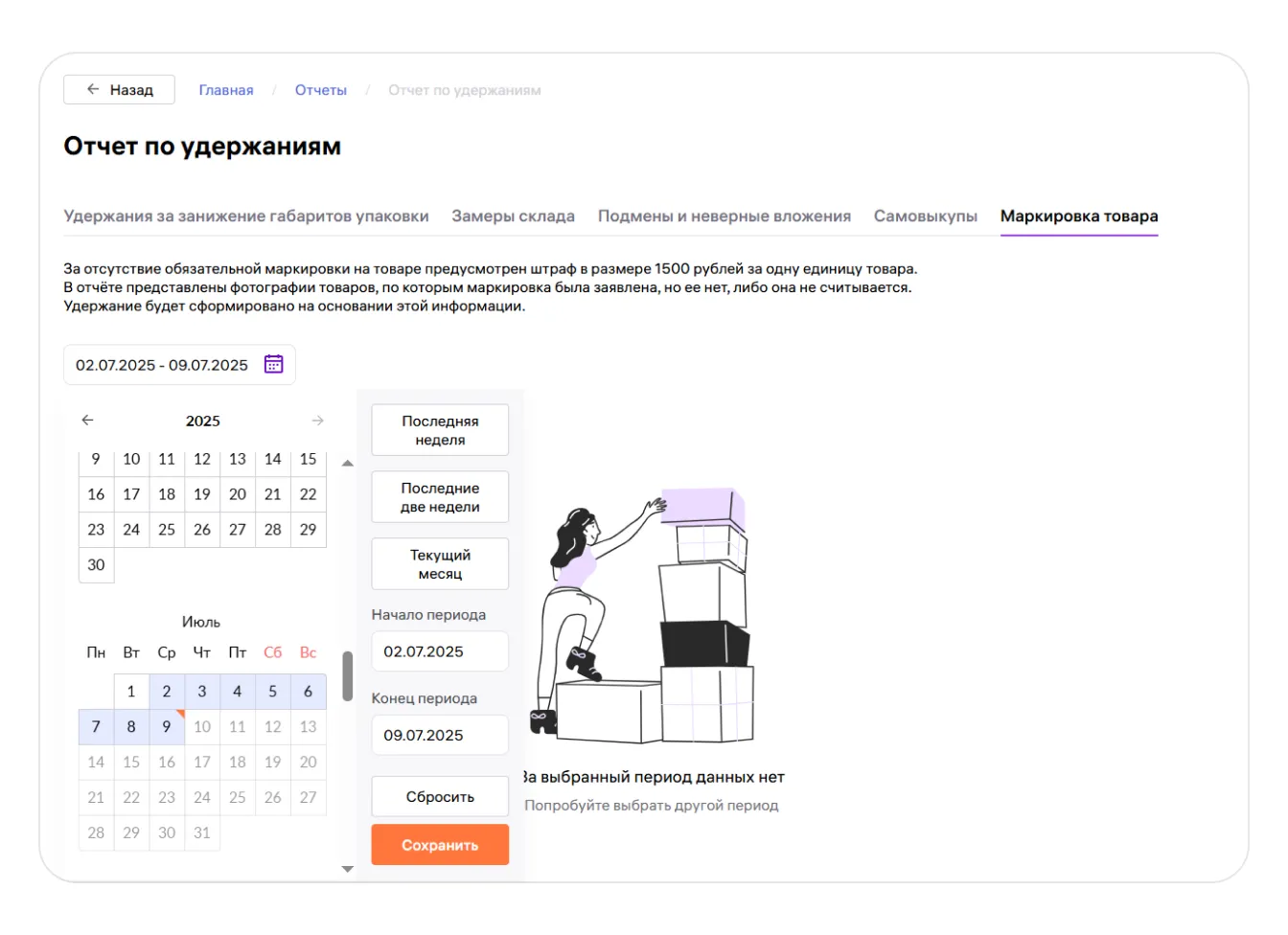 Чтобы посмотреть данные по интересующим вас удержаниям, перейдите на нужную вкладку, выберите нужный период в календаре и нажмите «Сохранить» — отчёт сформируется автоматически.