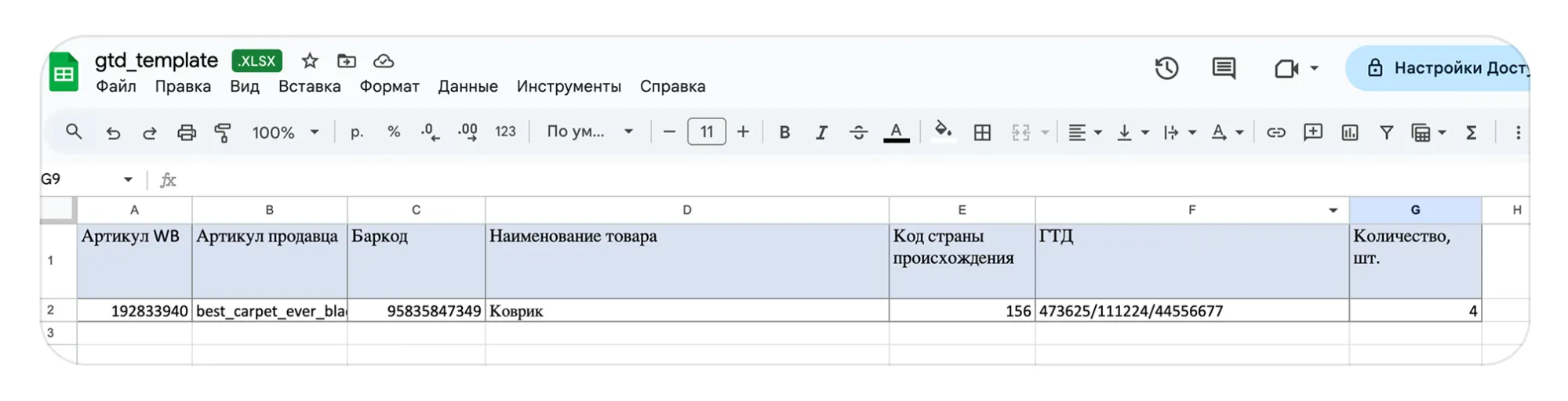 В файле для каждого артикула нужно указать всего два значения: код страны происхождения и номер ГТД. Остальная информация подгрузится в файл автоматически, из данных о поставке.