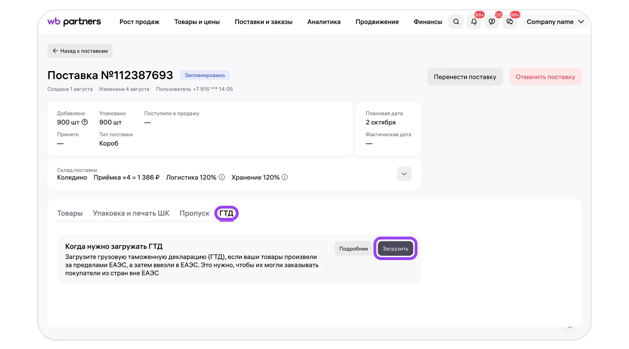 Кликните на нужную поставку в разделе «Поставки и заказы» → «Поставки (FBW)» и перейдите на вкладку «ГТД».
