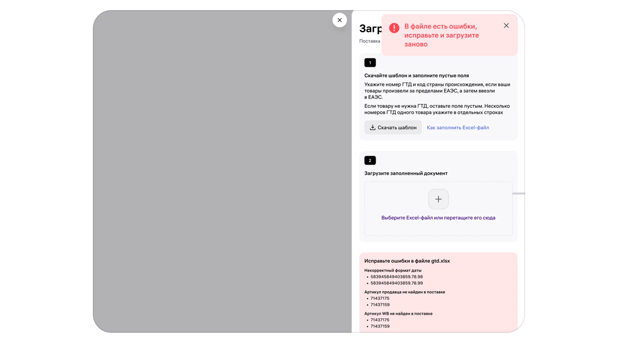 Если файл заполнен неверно, вы увидите сообщение об ошибке и подсказки, что следует исправить.