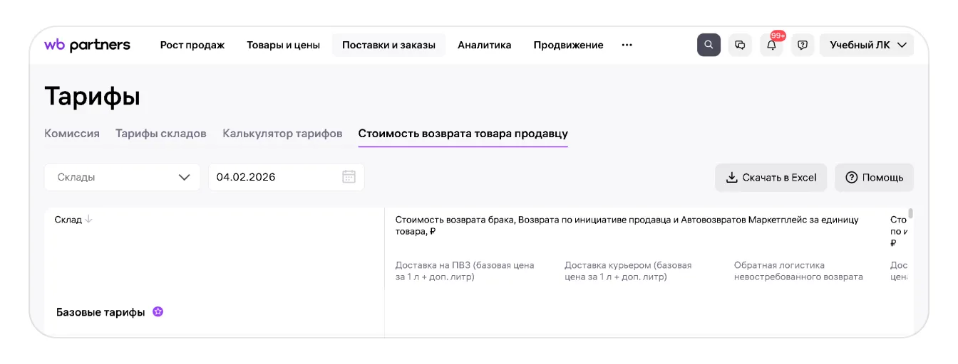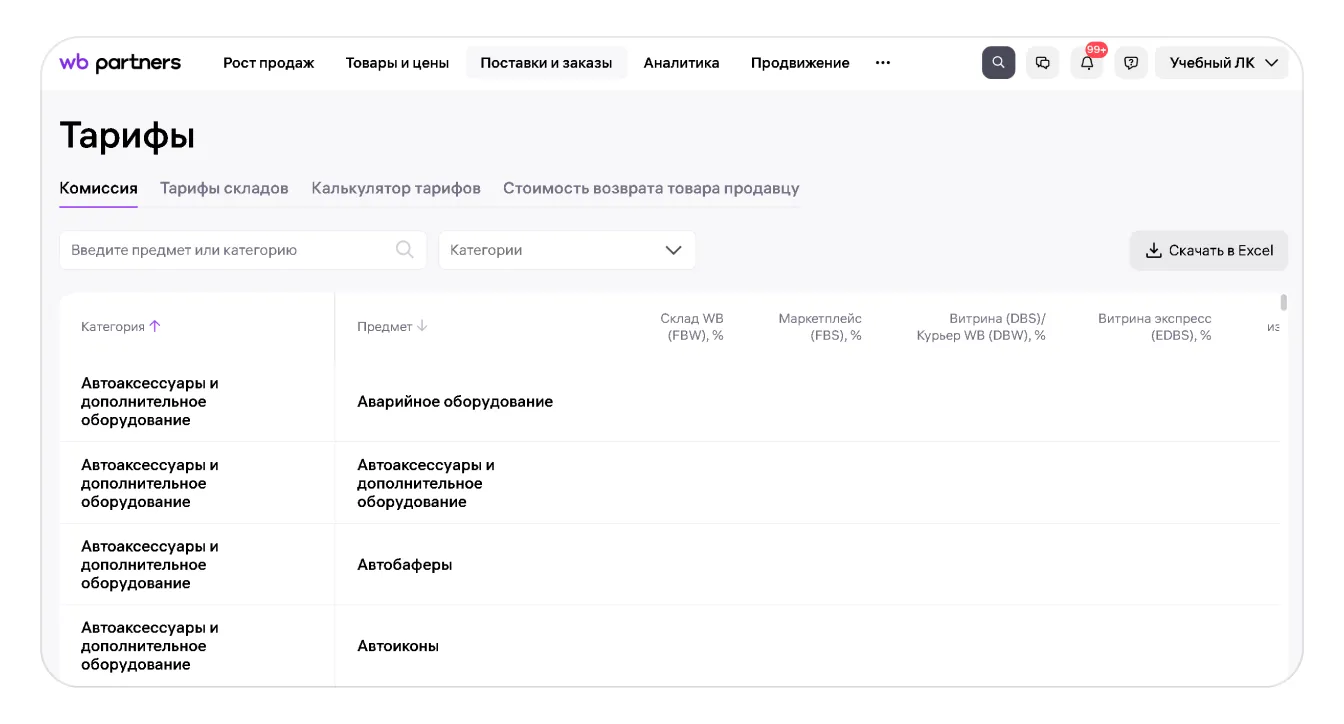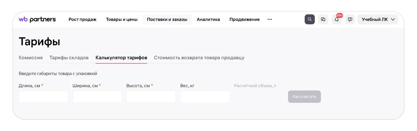 В разделе Поставки и заказы → Тарифы на портале продавца можно узнать размер комиссии для разных категорий товаров, рассчитать стоимость хранения и логистики, а также ознакомиться с коэффициентами склада и стоимостью возврата товара.
