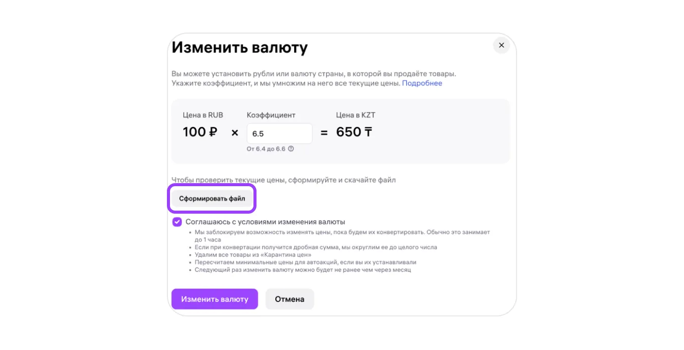 5. После этого нажмите «Изменить валюту» и подтвердите действие в следующем окне. 6. После подтверждения система начнёт пересчитывать цены. Обычно это занимает до 1 часа. В это время вы не сможете менять цены и скидки — ни на этой странице, ни в других разделах личного кабинета.