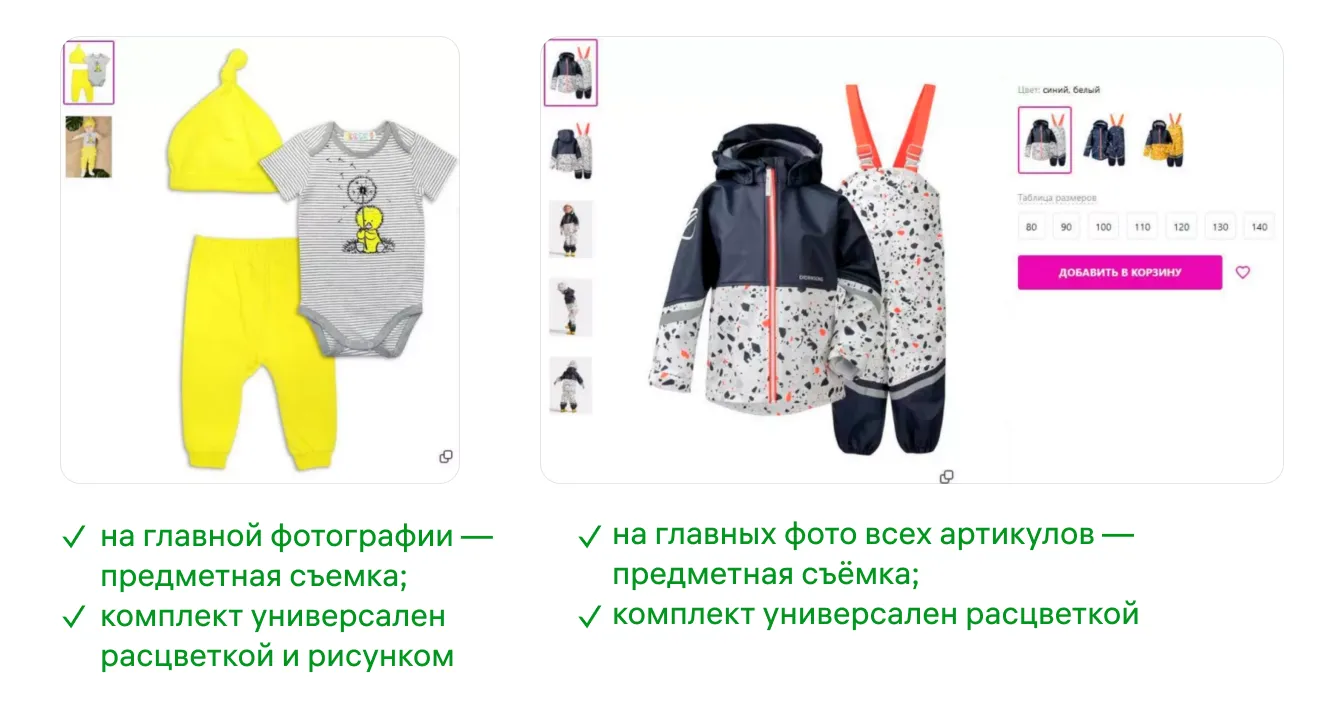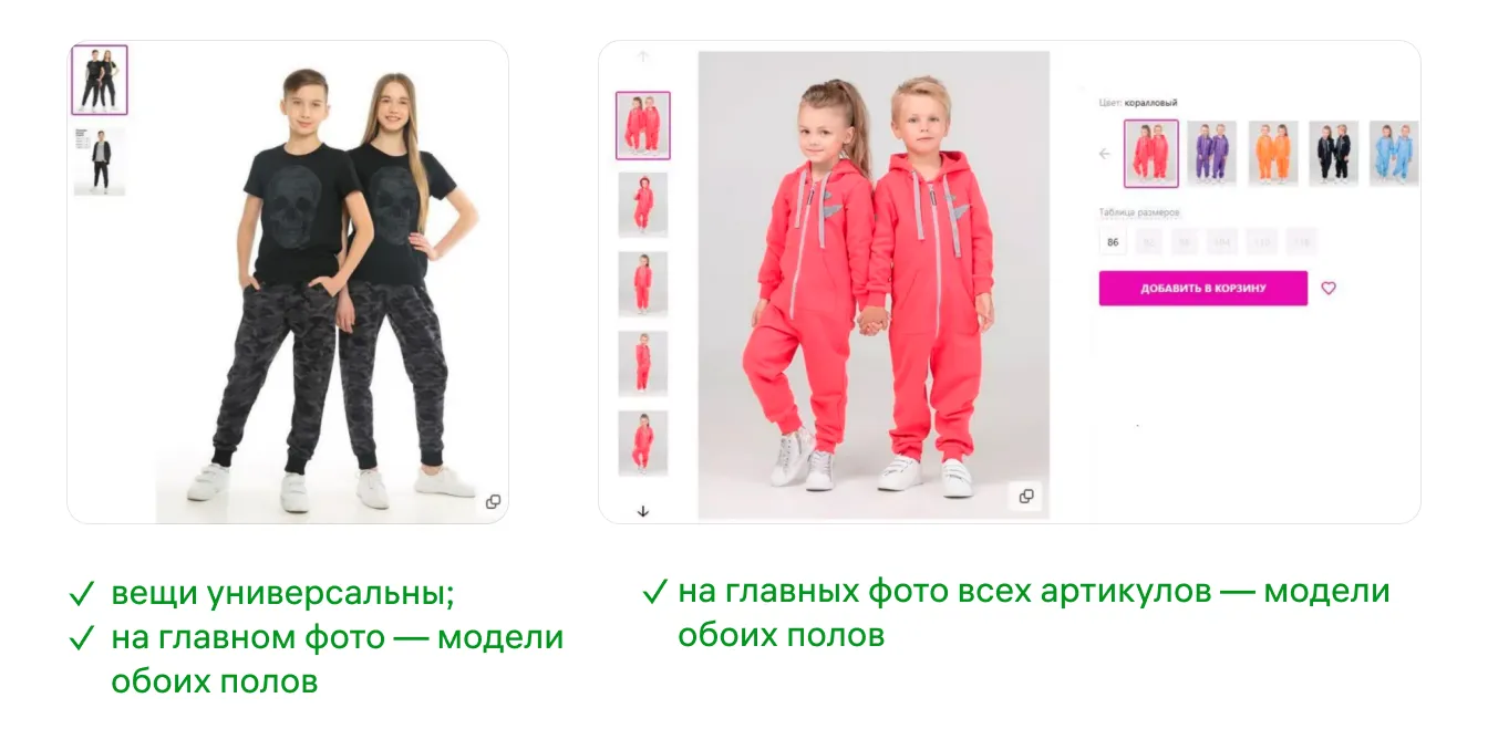 на главной фотографии в карточке — или дети обоих полов одновременно, или предметная съёмка, то есть без моделей.