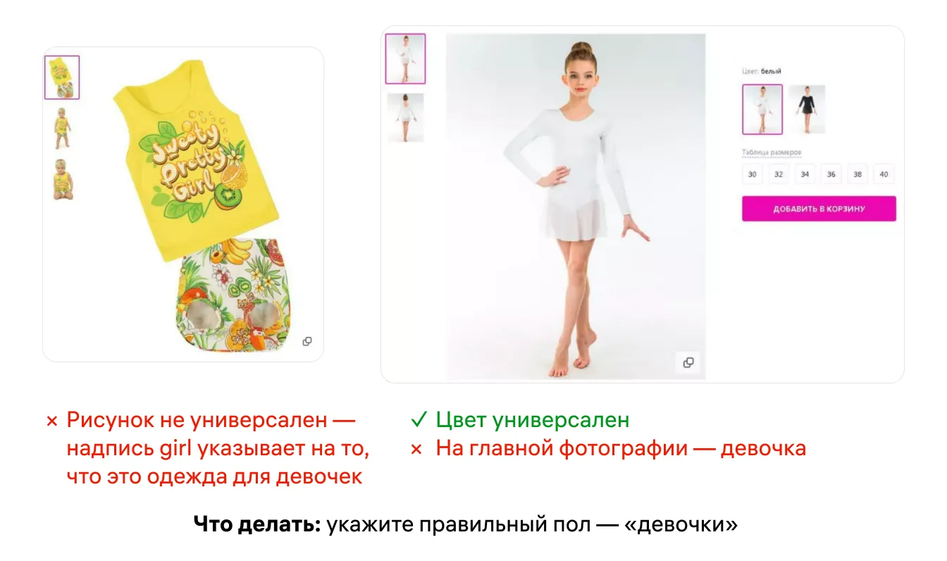 Если детский пол применили некорректно, мы можем самостоятельно изменить этот параметр в карточке или разделить её на несколько – в зависимости от того, что изображено на главных фотографиях артикулов в ней
