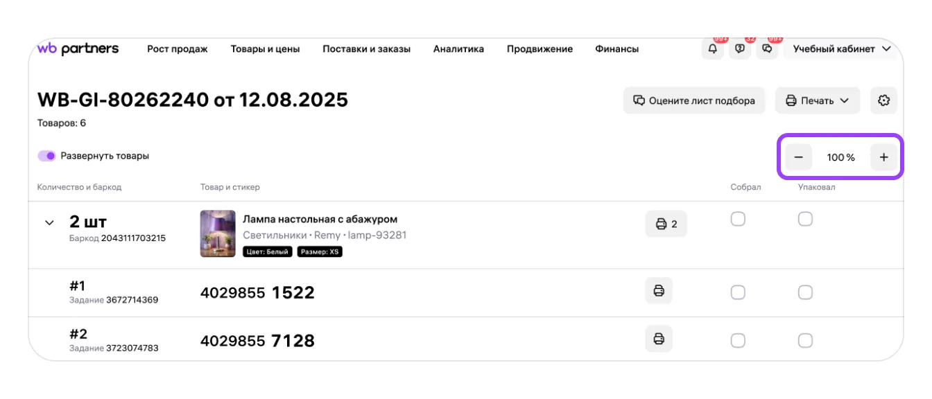 Лист подбора поможет вам быстрее собирать заказы по модели FBS. Информация обо всех товарах в поставке показана на интерактивном листе в удобном для сборки виде.