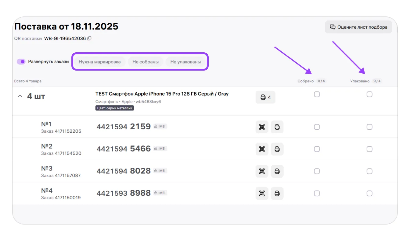 Через лист подбора вы можете добавлять коды маркировки прямо во время сборки заказов, а также вносить информацию о сроках годности для товаров в поставке.