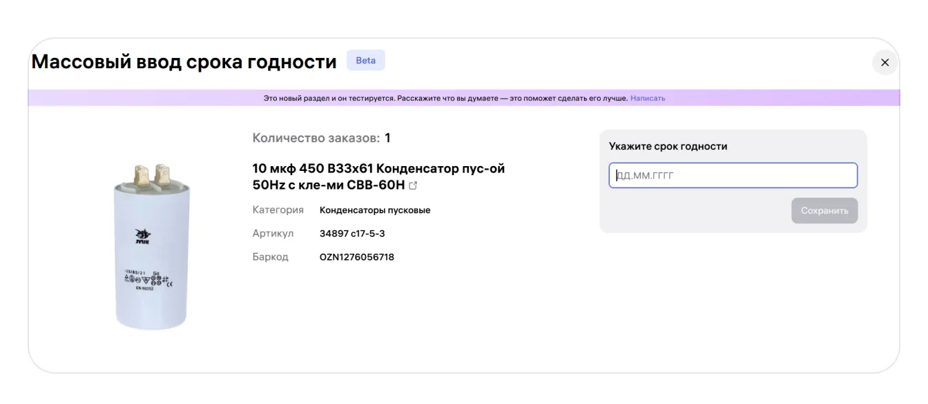 Вы можете добавить срок годности только для одного товара или указать его массово, сразу для всех заказов этого артикула в сборочном листе. Для этого нажмите на иконку календаря напротив товара.
