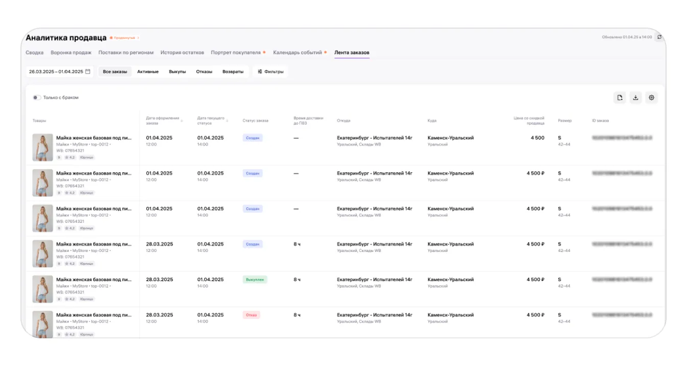 В «Ленте заказов» показываем все заказы, сделанные в вашем магазине. Записи обновляются автоматически: если покупатель выкупил товар или оформил возврат, вы увидите это сразу.