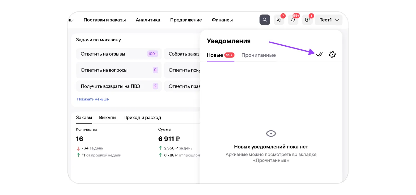 Чтобы отметить всё новое как прочитанное, нажмите на двойную галочку в правом верхнем углу окна уведомлений. После этого раздел «Новые» очистится, и все уведомления перейдут в «Прочитанные».