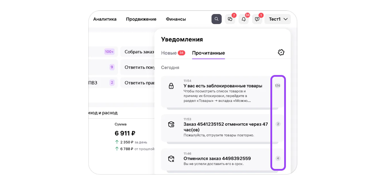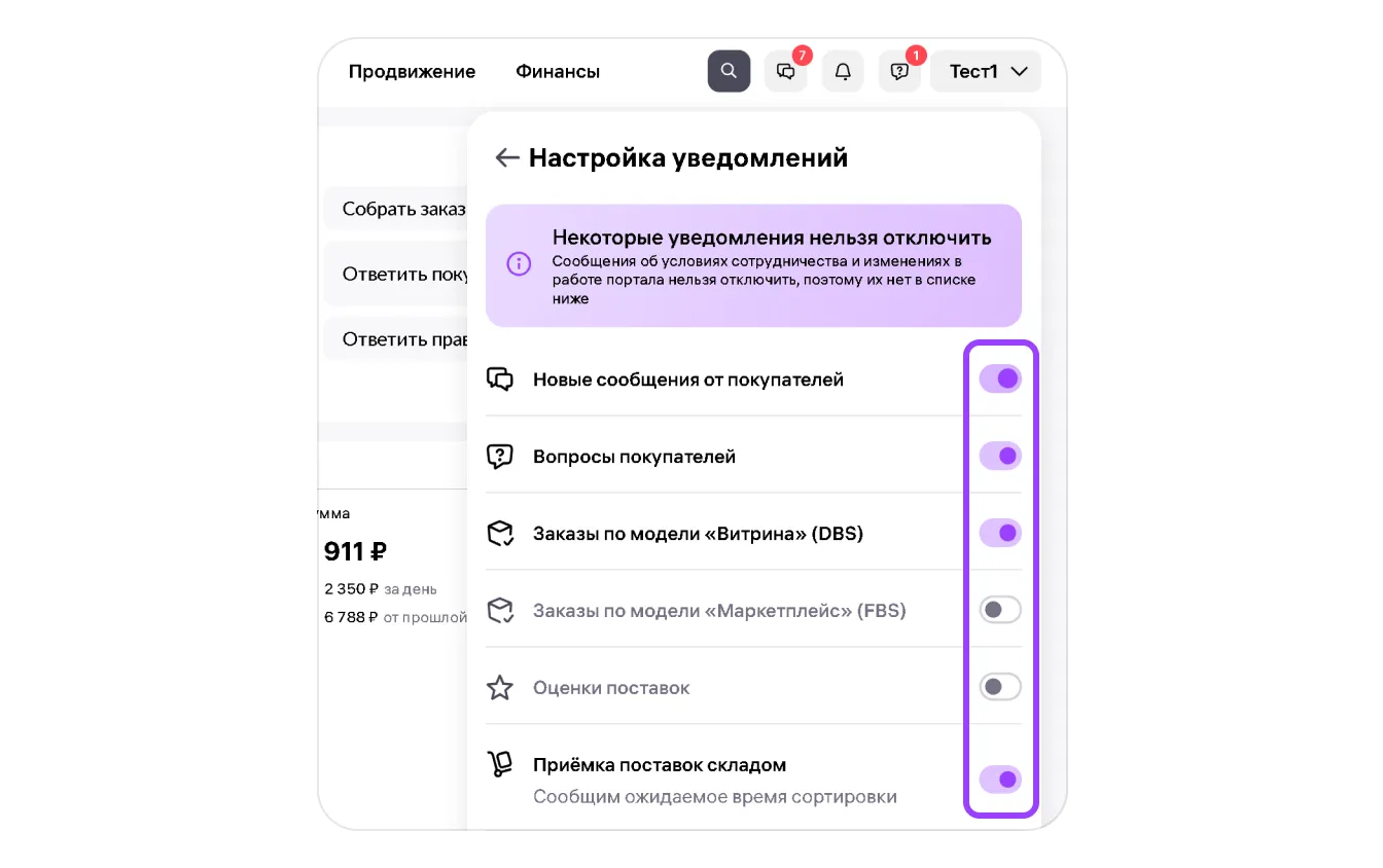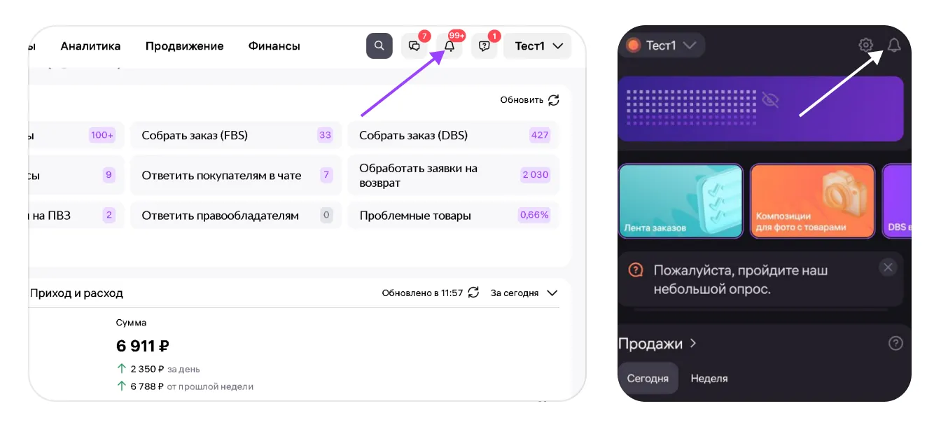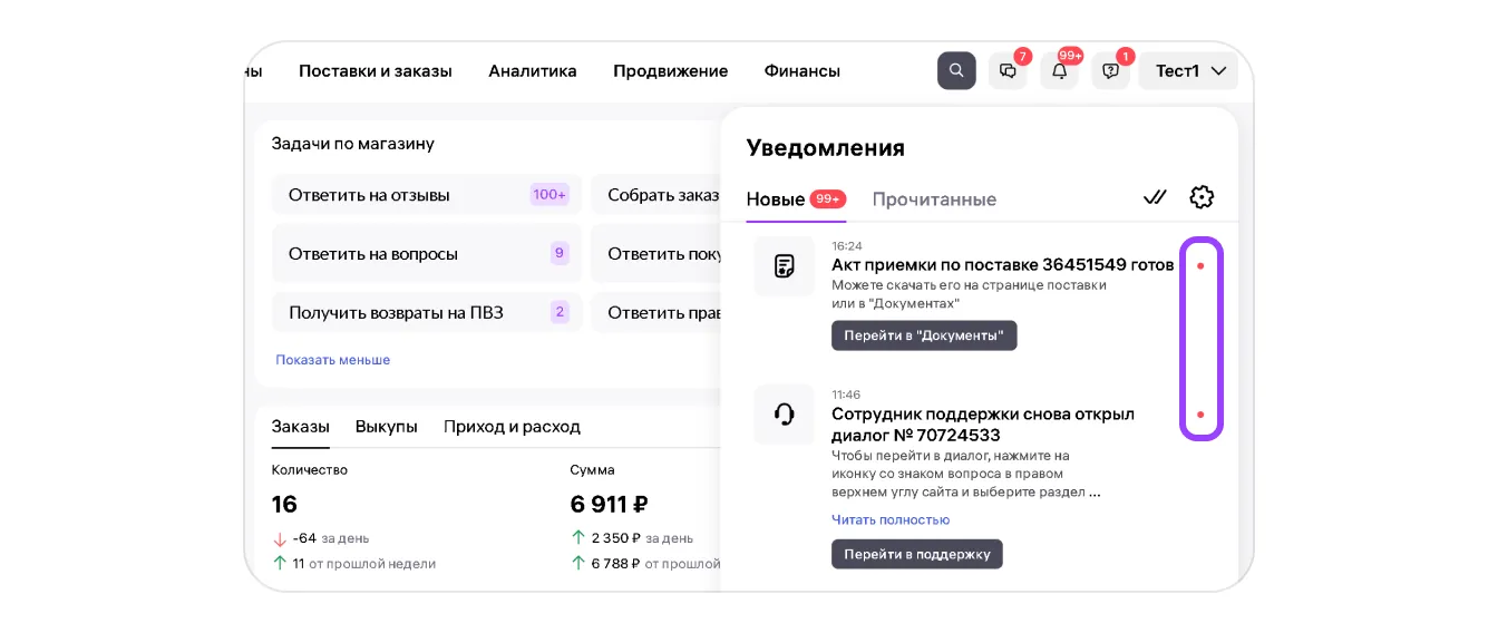 Уведомления в режиме реального времени сообщают продавцу о ключевых событиях и действиях на портале. Так вы можете узнать о поступлении новых заказов по моделям FBS, DBS и EDBS и их статусах, о появлении новых вопросов от покупателей, о заявках на возврат, начале промоакций и прочем.