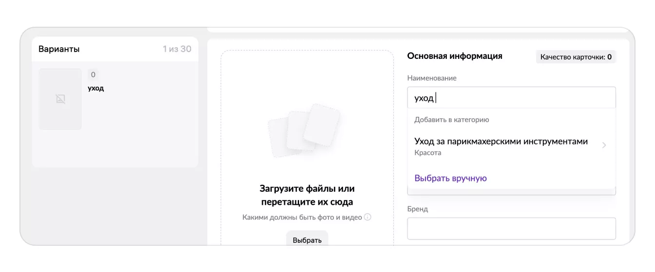 Просто начните вводить наименование товара при создании карточки. Мы проанализируем название и предложим подходящую категорию.