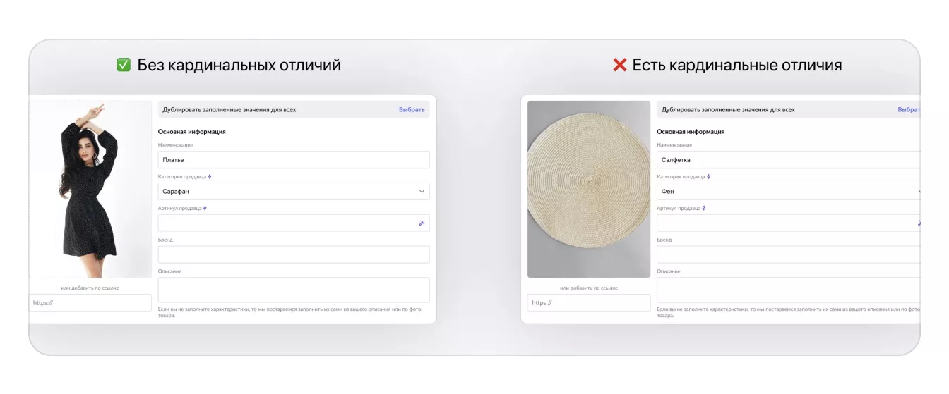 Когда фото и описание товара совсем не совпадают с выбранной категорией, для нас это выглядит как недобросовестное продвижение. Мы блокируем такие карточки. Правило зафиксировано в оферте (п. 9.2.3.)