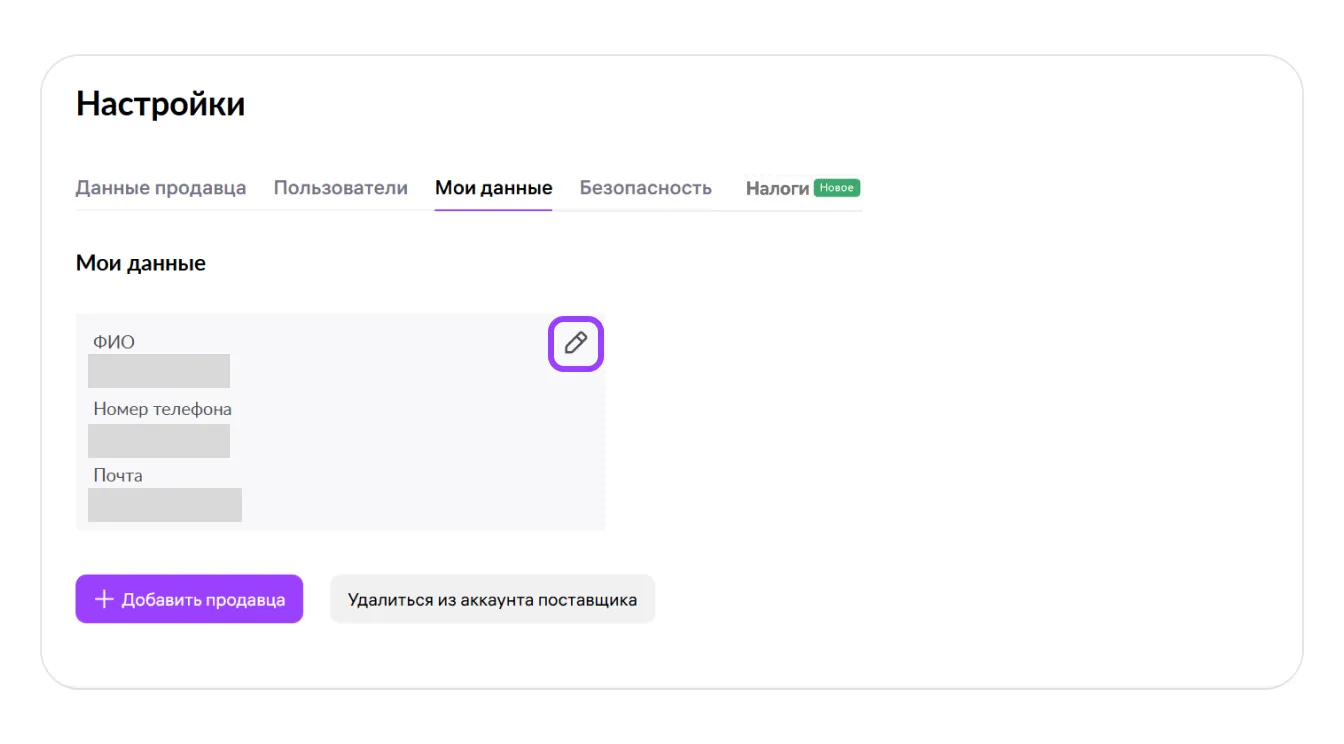 В этой вкладке можно перейти к регистрации нового продавца, отредактировать данные профиля или удалиться из профиля продавца. Чтобы редактировать данные, нажмите на значок карандаша.