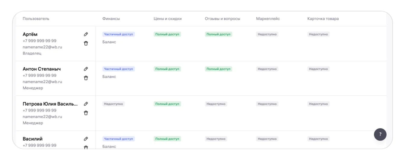 Чтобы настроить права доступа, владелец должен нажать на значок карандаша рядом с именем пользователя, указать доступ в нужные разделы и сохранить изменения.