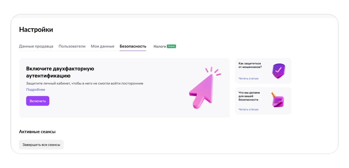 Во вкладке «Безопасность» можно подключить двухфакторную аутентификацию для защиты вашего профиля, а также увидеть и завершить активные сеансы.