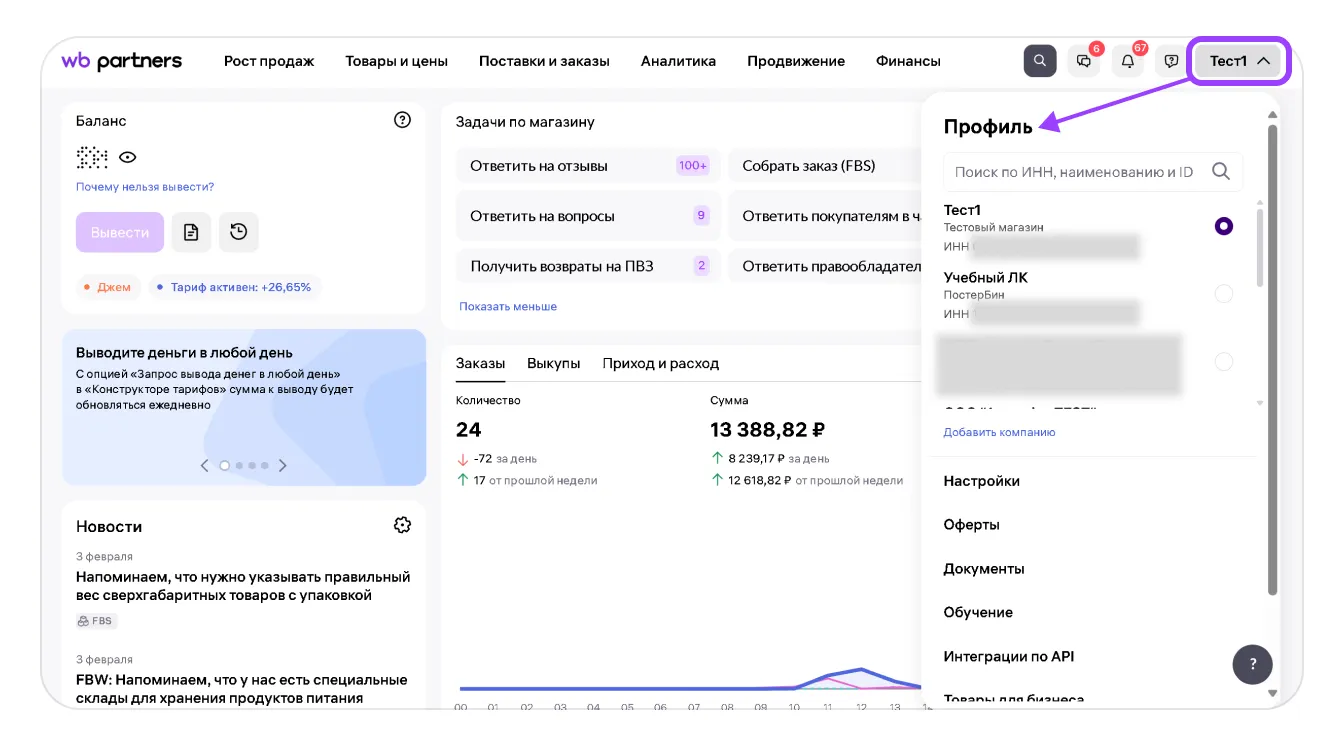 Чтобы открыть раздел «Профиль», наведите курсор на название вашей организации в правом верхнем углу экрана. Это ваш личный кабинет на портале WB Partners.