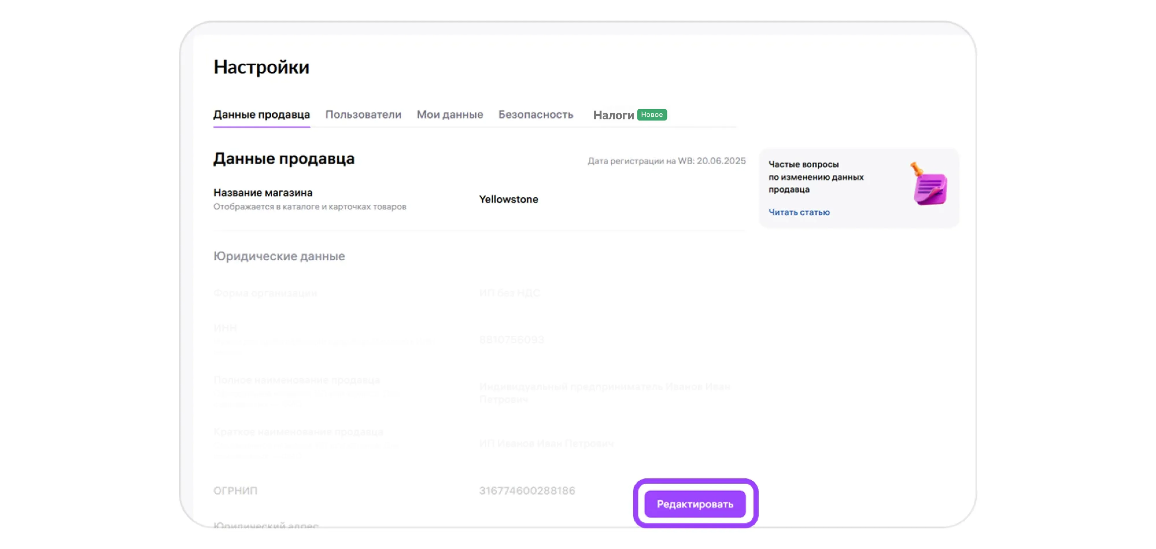 Только владелец может изменить реквизиты и данные продавца. Внизу экрана у него будет активна кнопка «Редактировать».