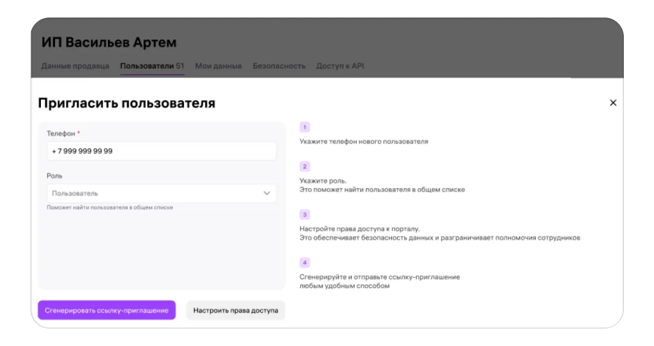 На этом этапе можно задать права доступа для пользователя: например, ограничить для него действия с разделами личного кабинета или доступ к финансовой информации. Для этого нажмите «Настроить права доступа» — откроется список возможных прав для пользователя. Выберите нужные.