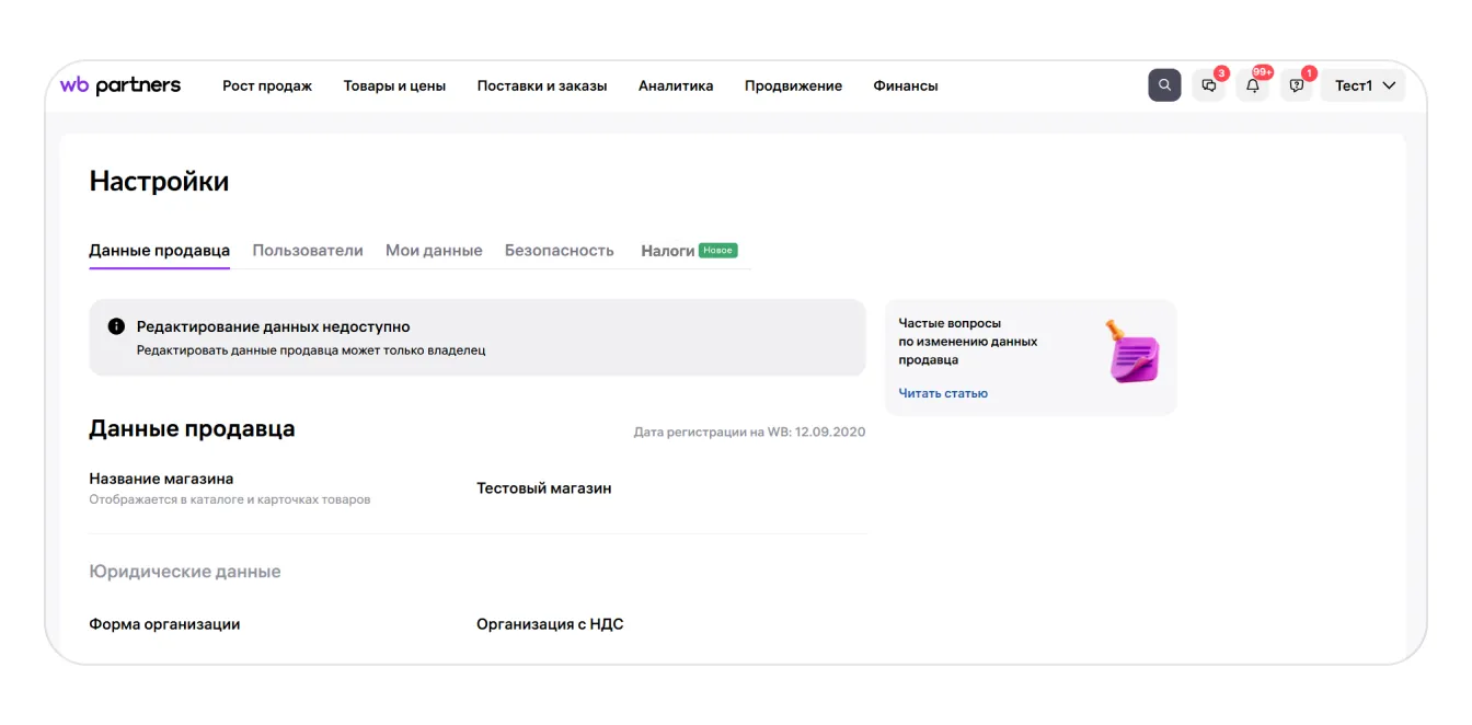 Регистрация нового продавца на портале WB Partners
