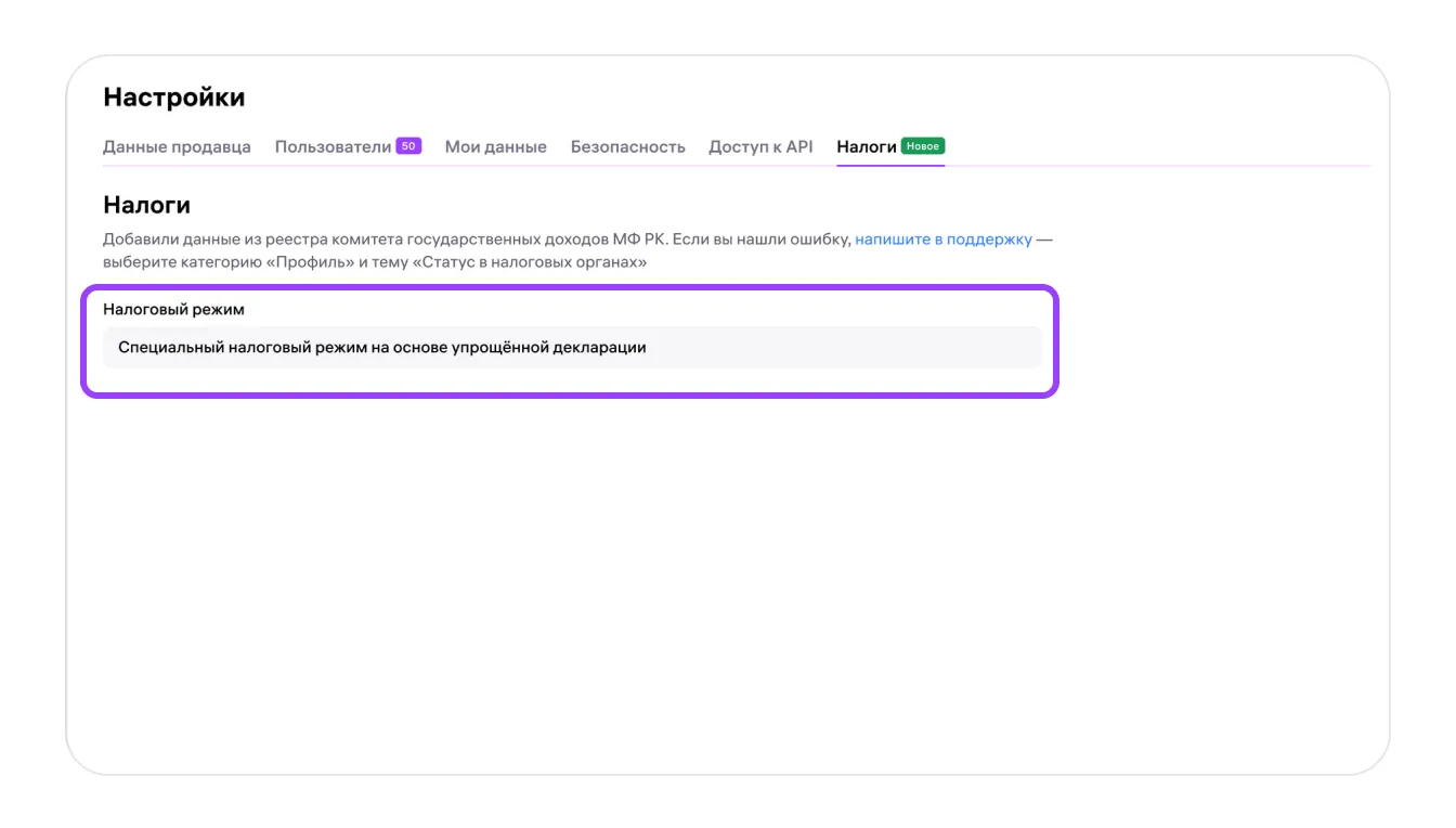 Во вкладке «Налоги» отображается ваш налоговый режим. Мы указываем его на основе данных из реестра Министерства финансов Республики Казахстан.
