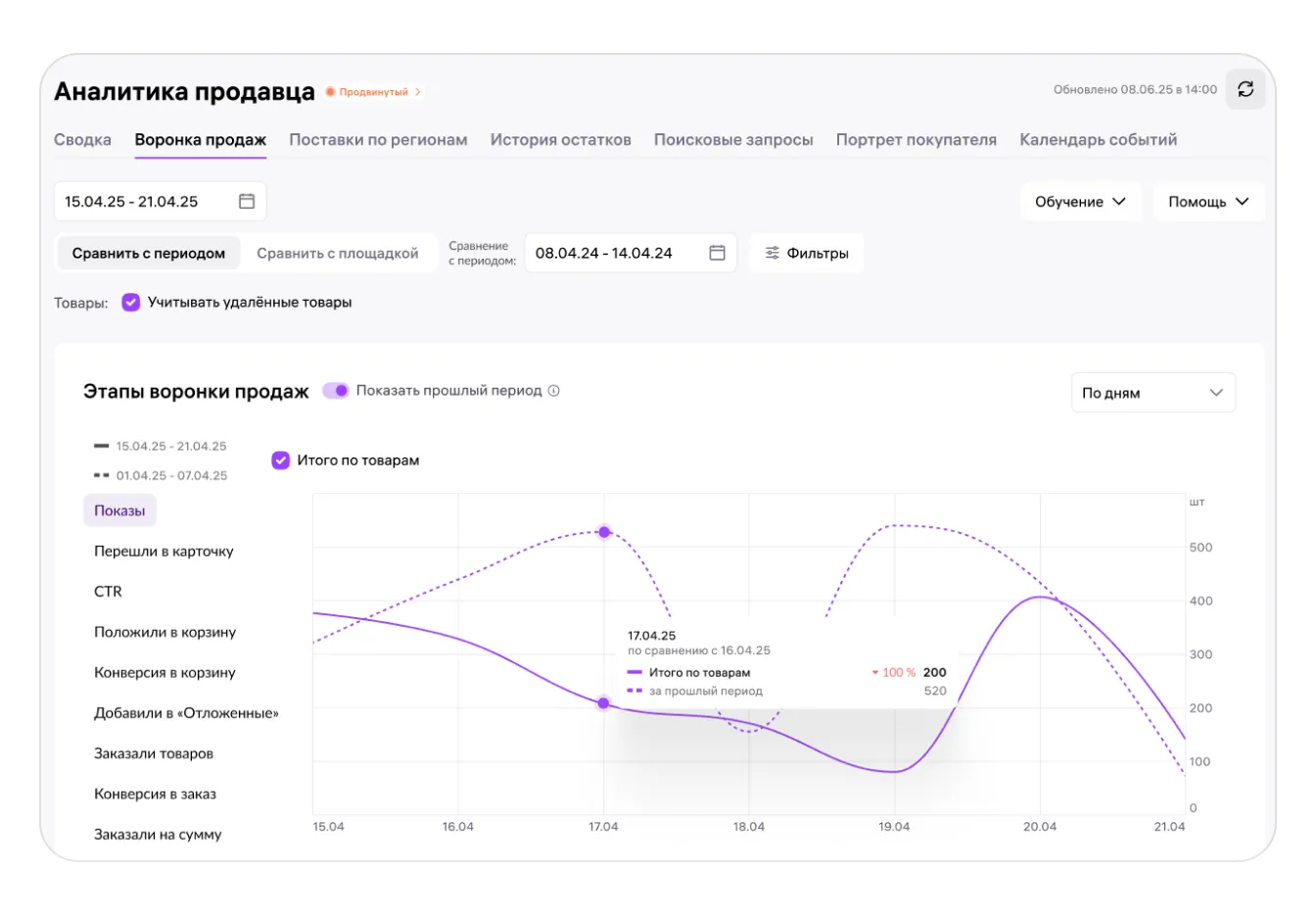 • следить за динамикой метрик воронки продаж по вашим карточкам товара;