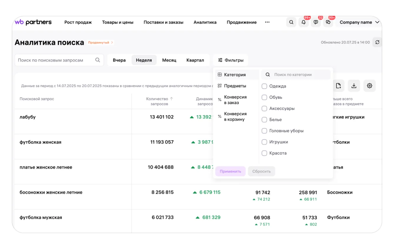 В бесплатной версии доступен только фильтр по предмету: он покажет запросы, по которым пользователи заказали больше всего конкретных предметов. В фильтре доступны все предметы, которые продаются на WB. Можно выбрать несколько разных предметов.