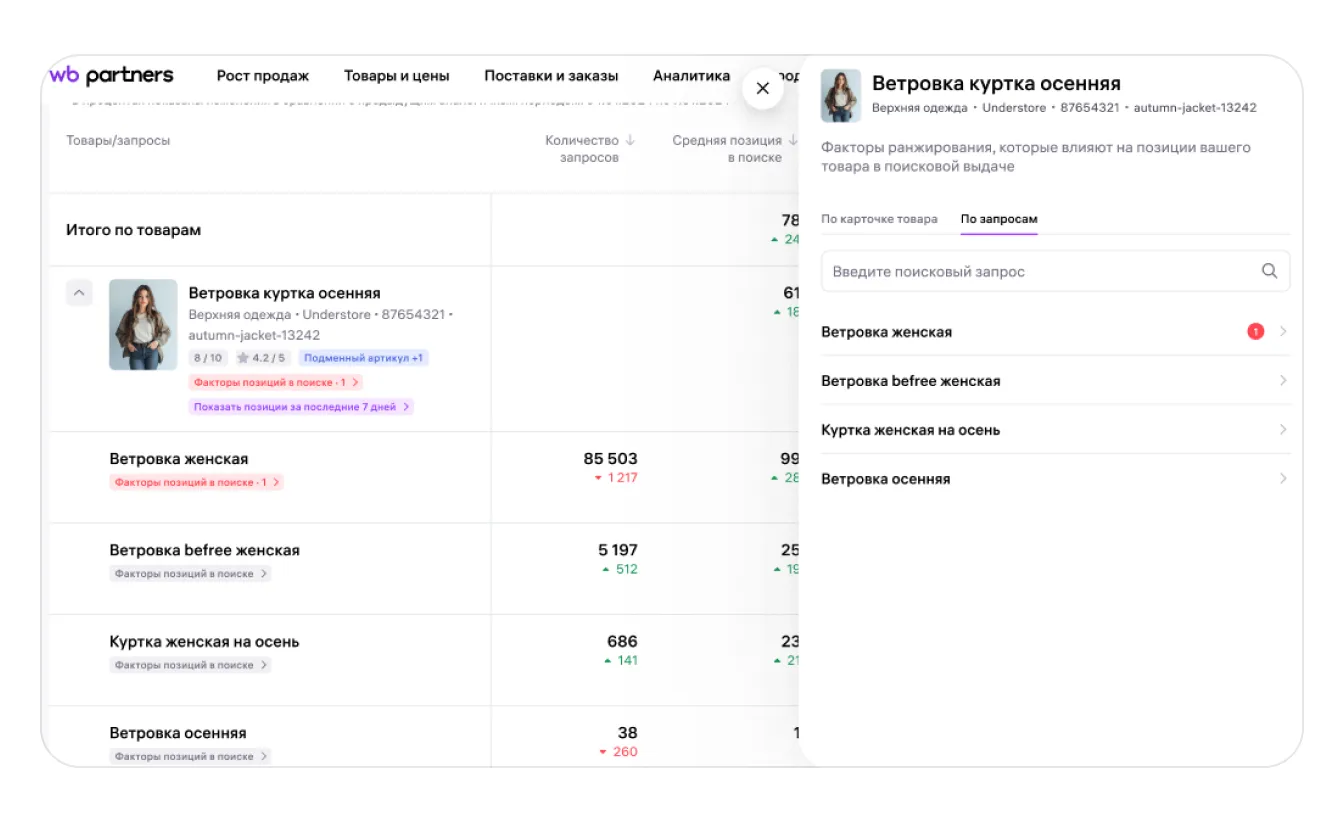 Чтобы понять, что влияет на место карточки в поиске и по каким запросам карточку находили покупатели, нажмите «Факторы позиций в поиске». Справа откроется окно с двумя вкладками — «По карточке товара» и «По запросам».