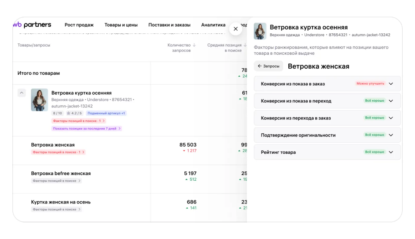 В таблице собраны данные по вашим товарам и их месту в поисковой выдаче в соотношении с товарами других продавцов. Здесь же показаны запросы, по которым покупатели находят ваши товары в поиске, факторы, которые повлияли на позицию ваших карточек, и рекомендации по улучшению позиций.