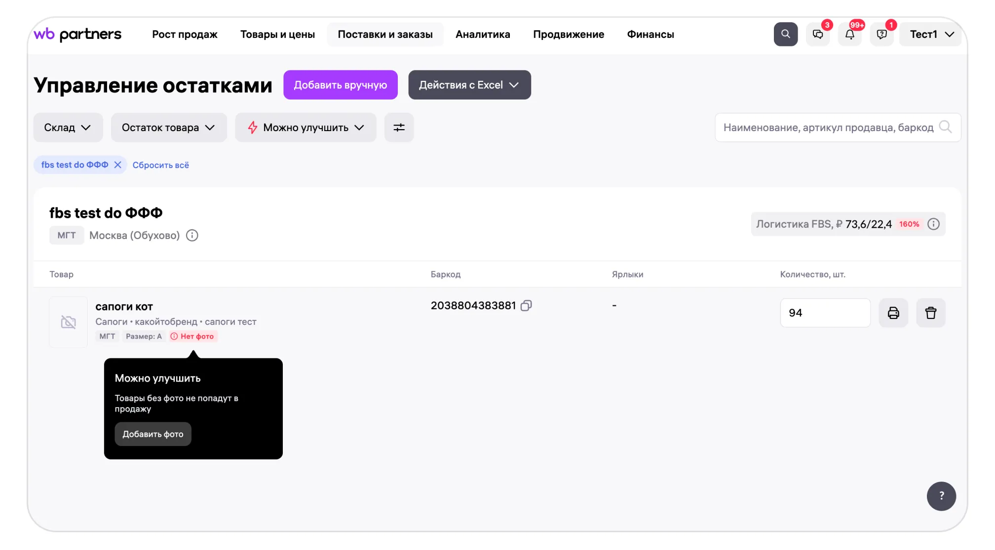 Кликните на него, чтобы перейти в Управление остатками. Там в общем списке карточки с проблемами отмечены красными статусами-подсказками. Чтобы исправить ошибки, кликайте на статусы — справа откроется панель со ссылками на разделы портала. Перейдите туда, чтобы добавить фото в карточку или установить правильную цену.