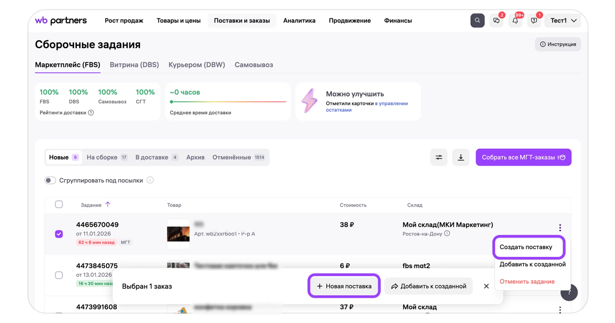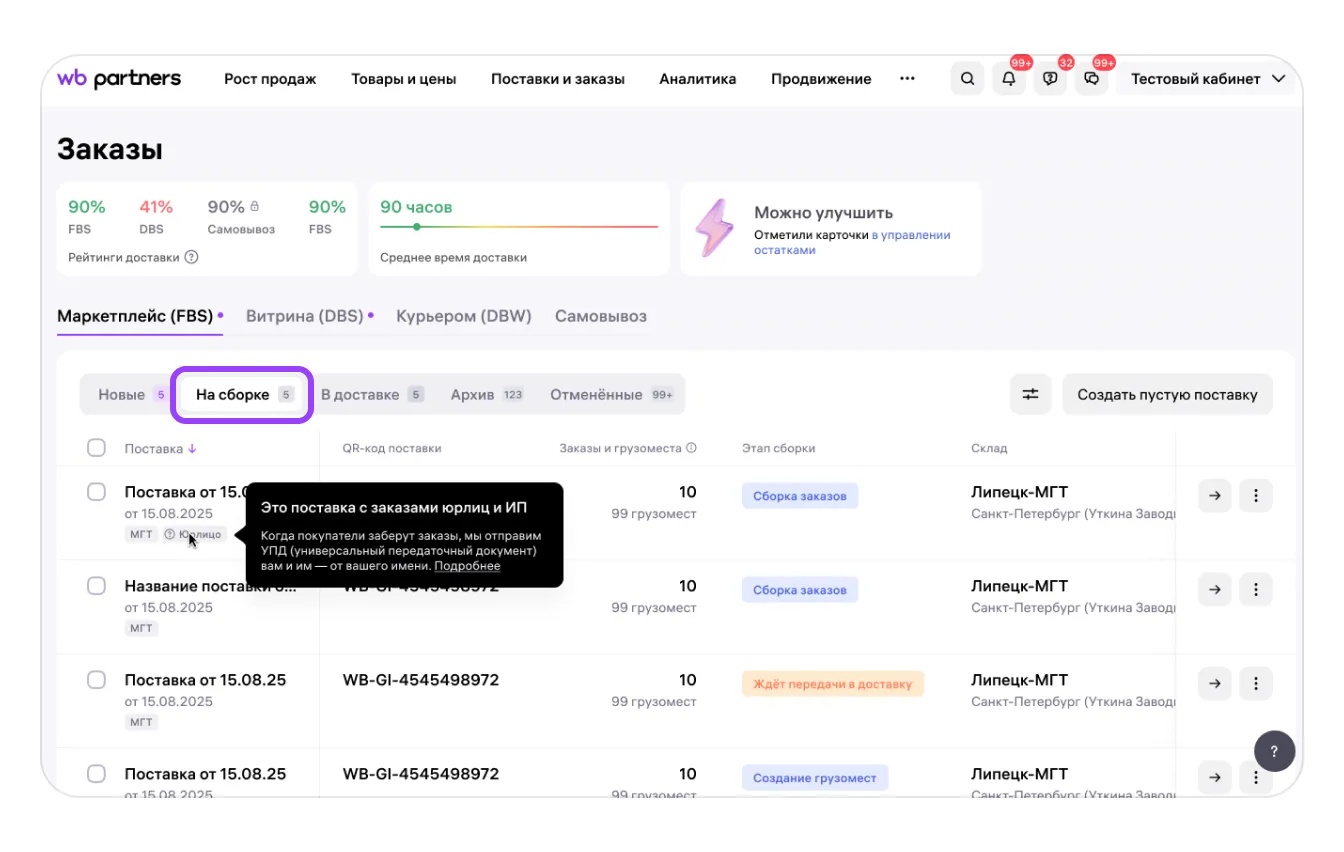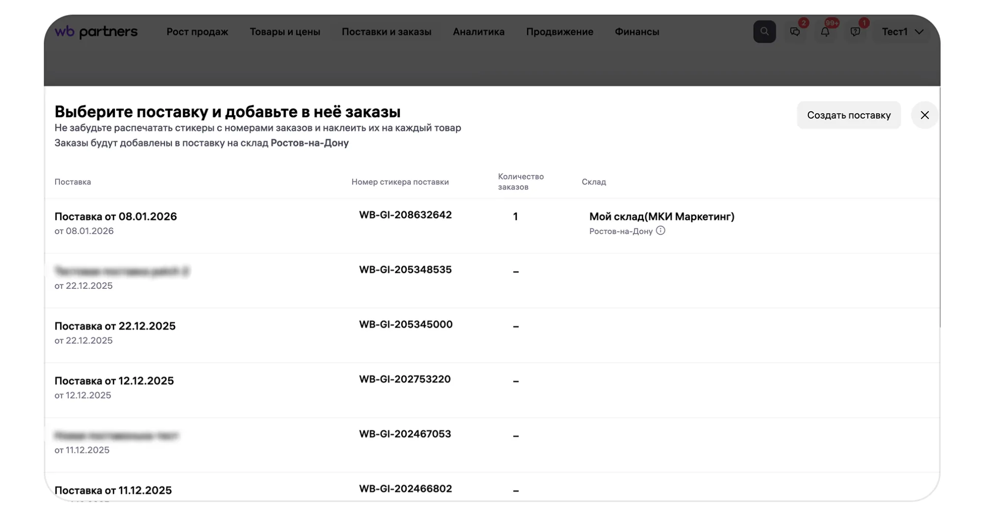 Поставка — это один или несколько заказов, которые вы объедините и повезёте на склад, в сортировочный центр или ПВЗ. Чтобы создать поставку: