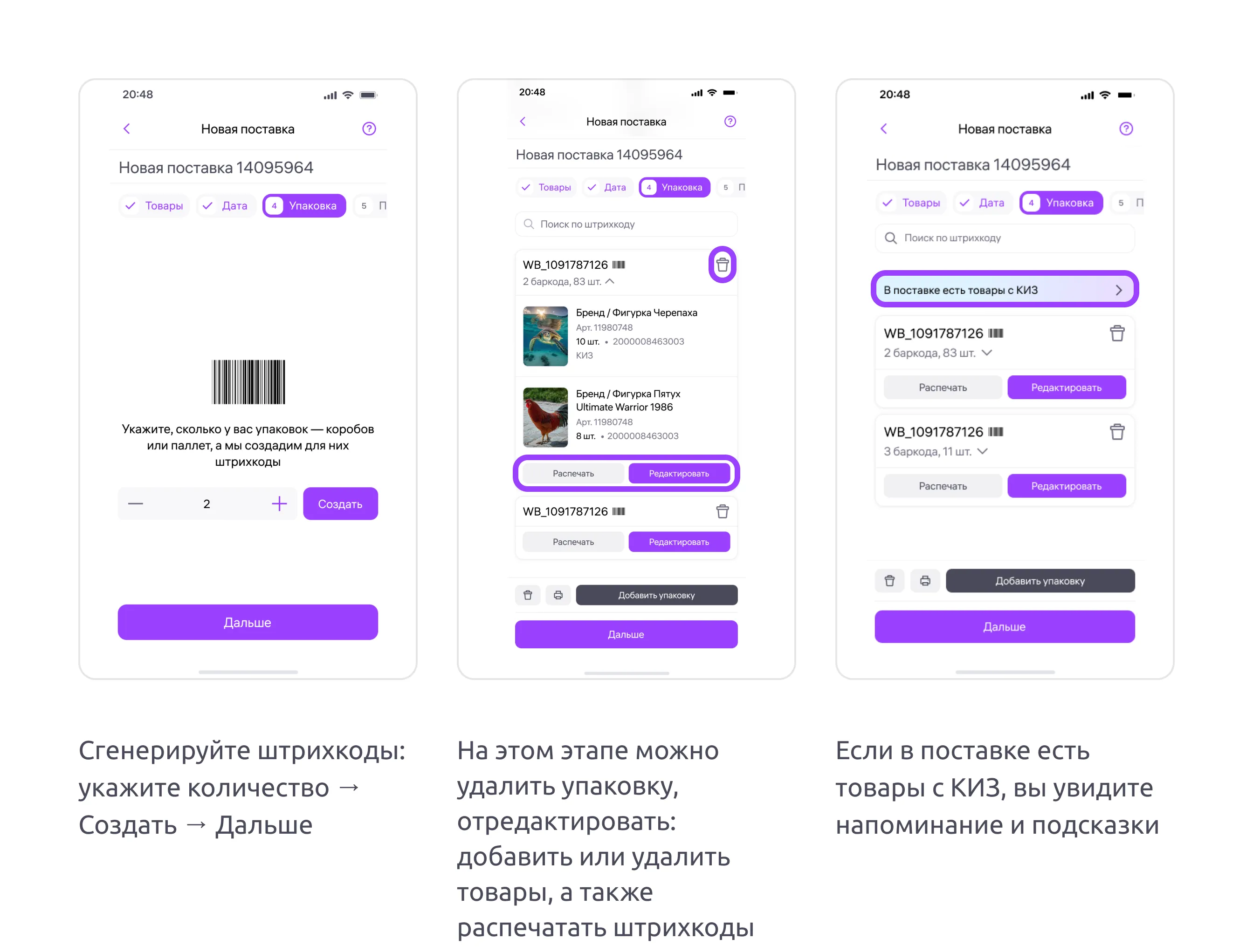 На прошлом этапе вы добавили товары в короба и выбрали дату поставки. Следующий этап — оформление штрихкодов.