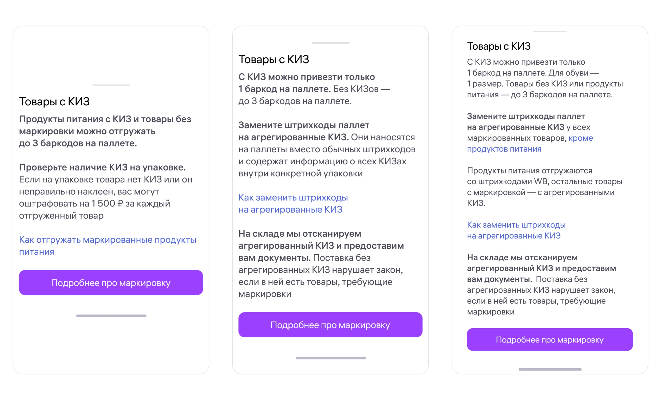 Если тип поставки — «Поштучная паллета» или «Монопаллета», в одну паллету можно добавить не больше 3-х баркодов.
