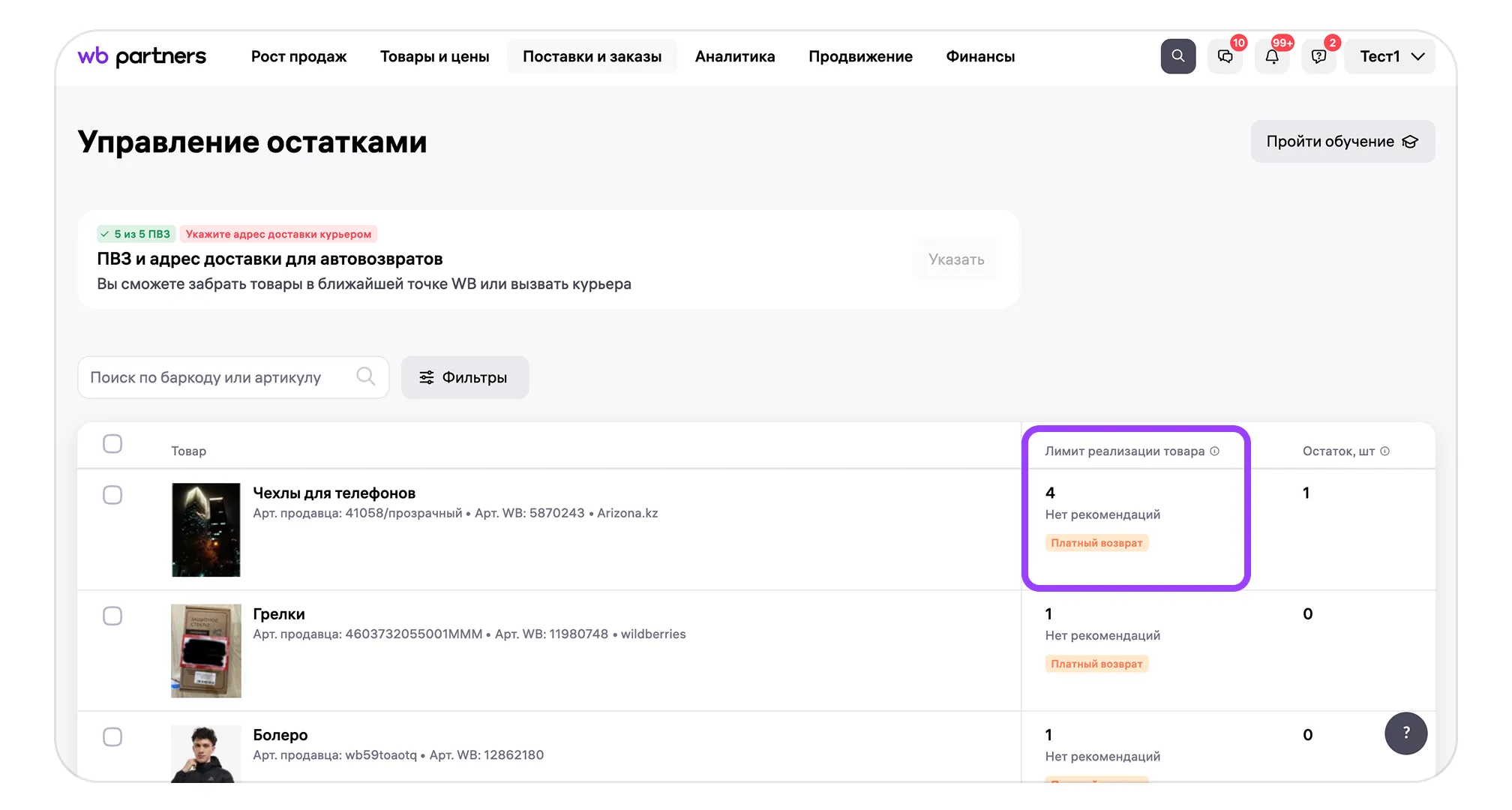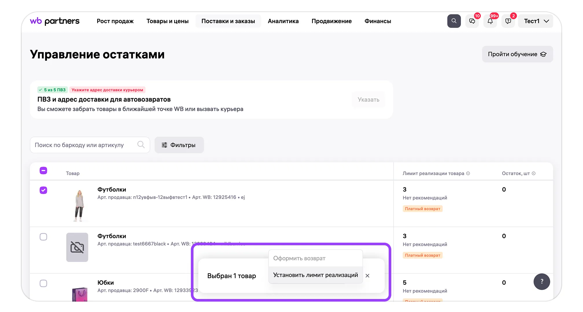 Обратите внимание, отключить уже установленный лимит реализации пока нельзя. То есть если вы установите, например, для куртки лимит реализации 6, товар в любом случае вернётся в ПВЗ после шести возвратов. Возможность отмены назначенного лимита мы скоро добавим.