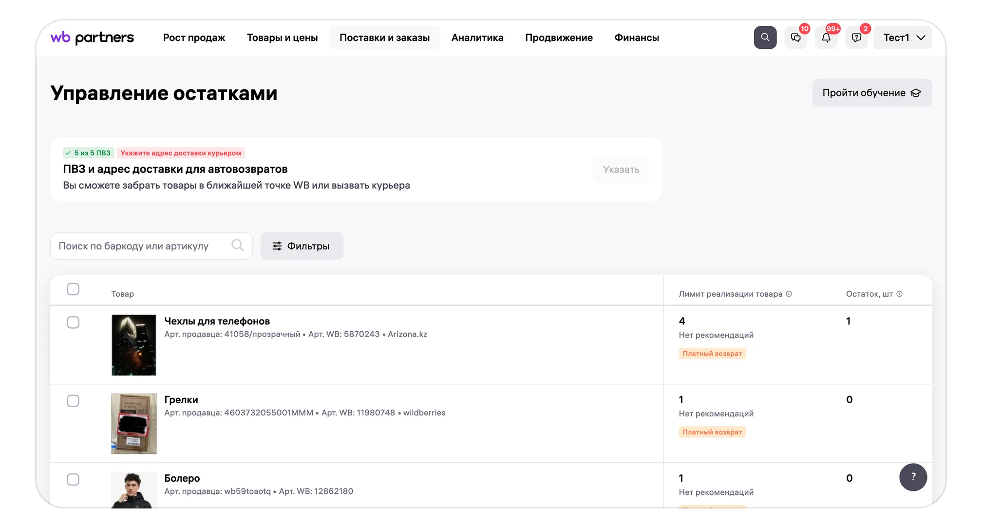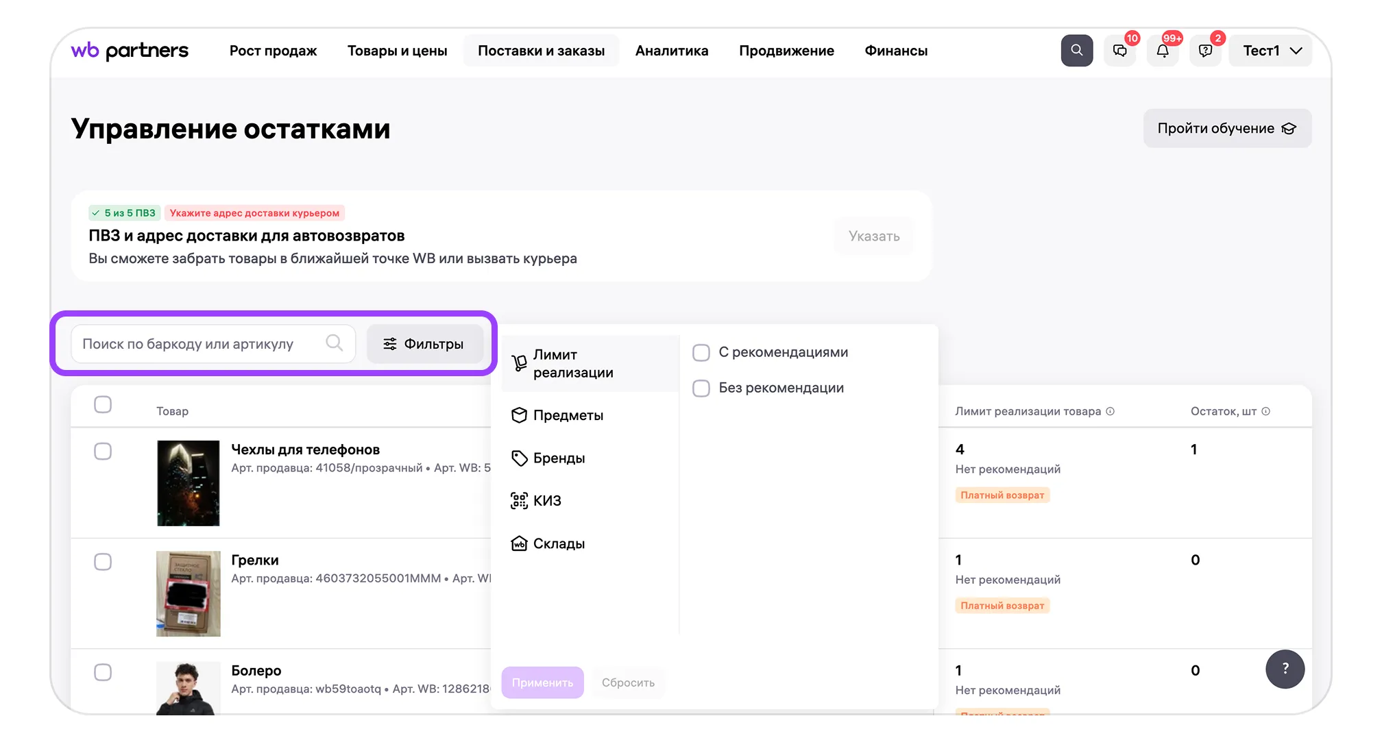 «Управление остатками» по модели FBW пока работает только в веб-версии портала продавца. В мобильном приложении WB Partners эта функция недоступна