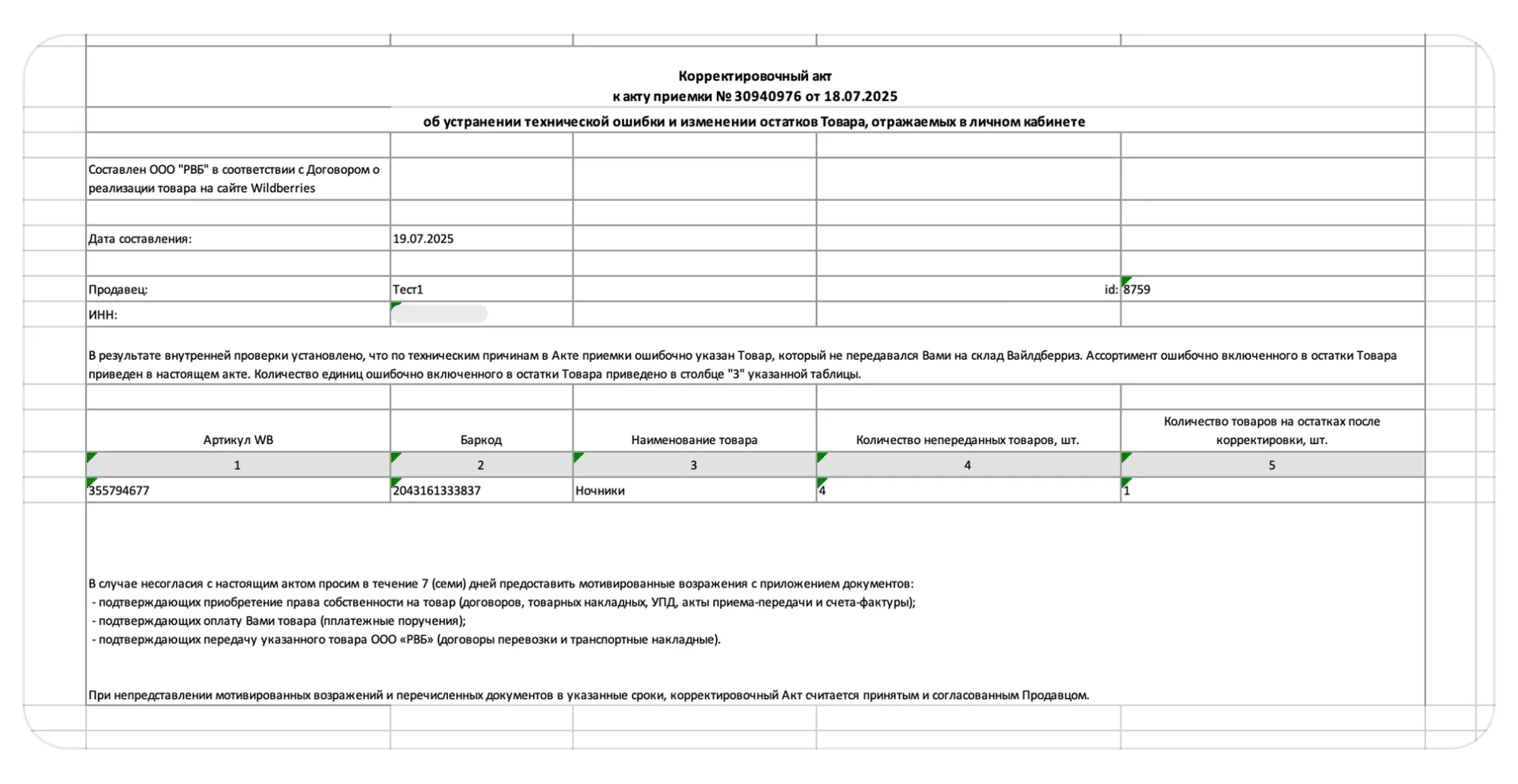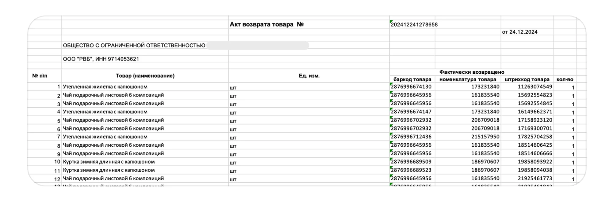 Акт возврата товара (неверное вложение);