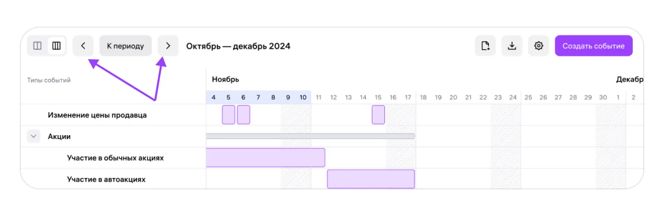 Выбранный временной период в календаре подсвечен синим. С помощью скролла по таблице можно перемещаться назад и вперёд от выбранного периода в рамках трёх месяцев. Если нужны данные за другие периоды, до года назад или вперёд от сегодняшней даты, используйте стрелки: