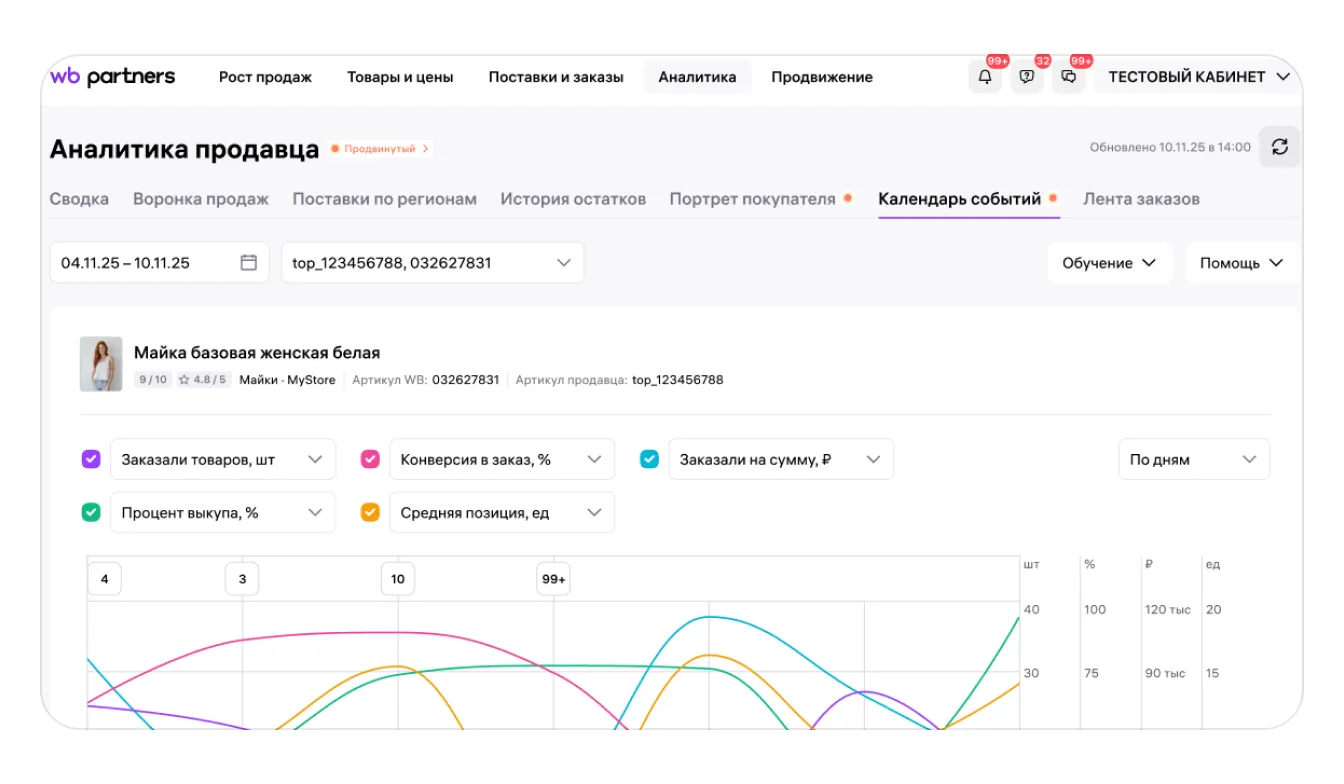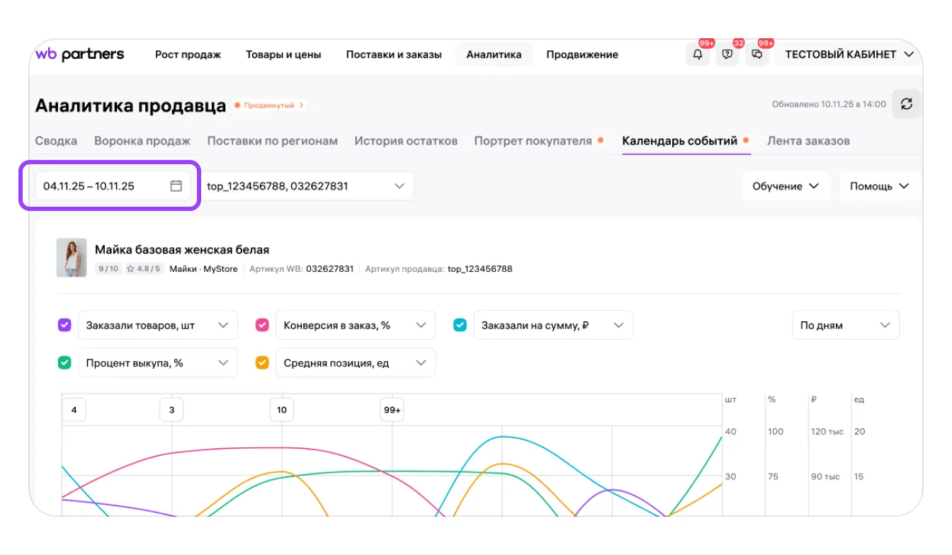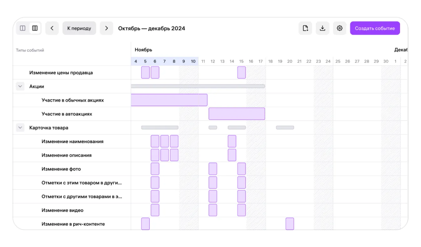 В отчёте показаны события, которые происходят с карточками товаров в вашем магазине, например изменения цены или фото, и то, как всё это влияет на этапы воронки продаж и другие бизнес-метрики. Свой календарь событий есть у каждой карточки, кроме удалённых.