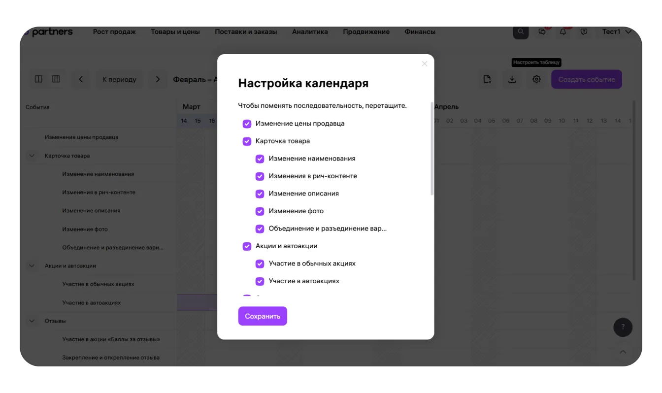 В таблице показан список событий за выбранный период, которые произошли с карточкой товара. Все эти события собраны в смысловые группы: события, которые относятся к карточке товара, к акциям и так далее. Эти группы событий можно настраивать: скрывать или показывать в настройках и менять порядок событий внутри них. Однако переносить события между группами или создавать собственные группы нельзя.