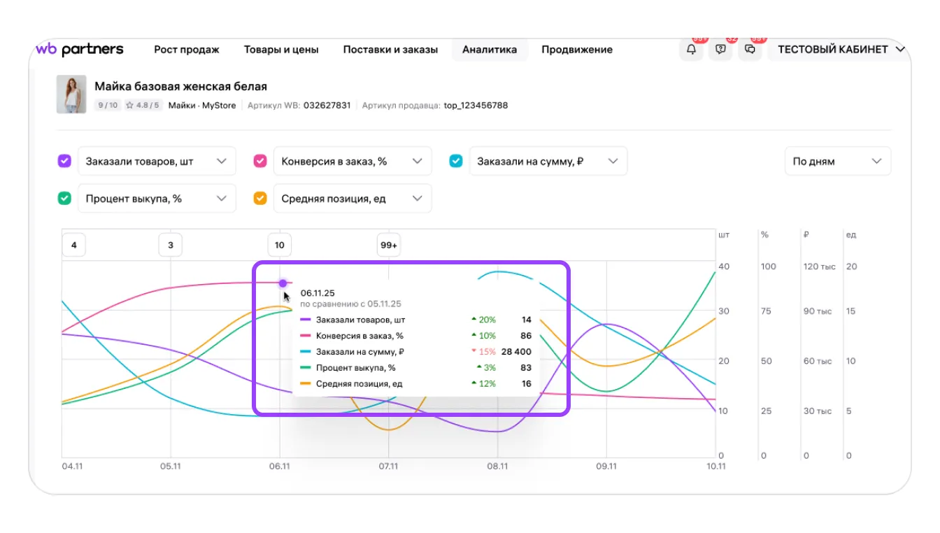Под фото товара — график сравнения показателей в динамике. Одновременно можно сравнивать до пяти показателей. Например, вы можете сравнить изменения в цене с позицией в поиске за неделю или месяц и с количеством заказов.