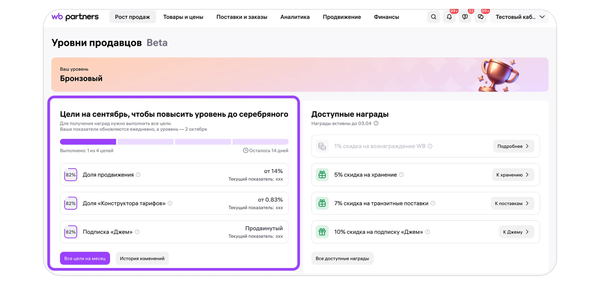 Чтобы повышать свой уровень в программе, продавайте товары и достигайте целей. Посмотреть уровень: Рост продаж → Программа «Уровни продавцов»