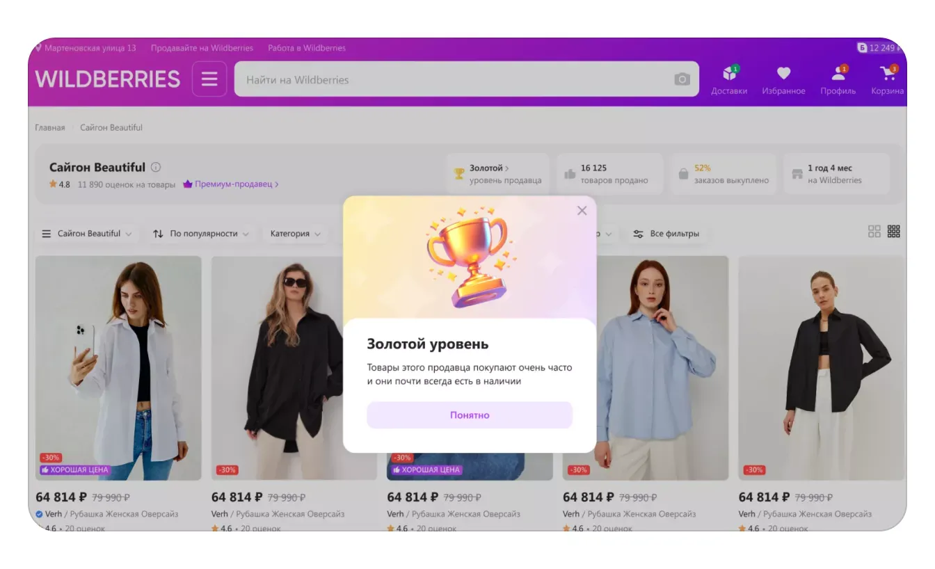 Продавцы с уровнем «Бронзовый» и выше получат бейдж, который отобразится на странице магазина — его увидят все покупатели: